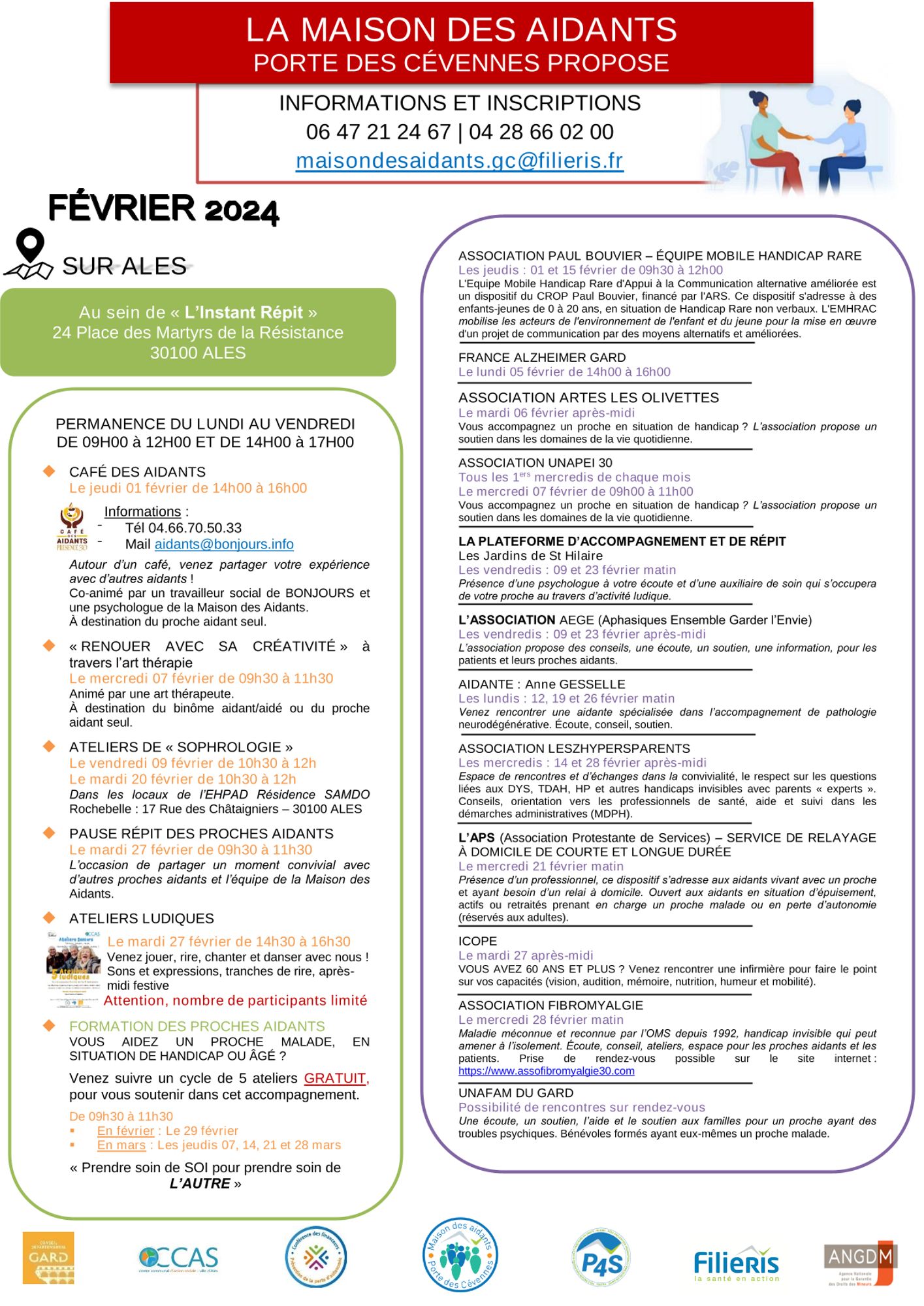 - Le "Rendez-vous des aidants", le 15 février de 14h à 15h30, 17 rue Albert Chambonnet – 30160 Bessèges