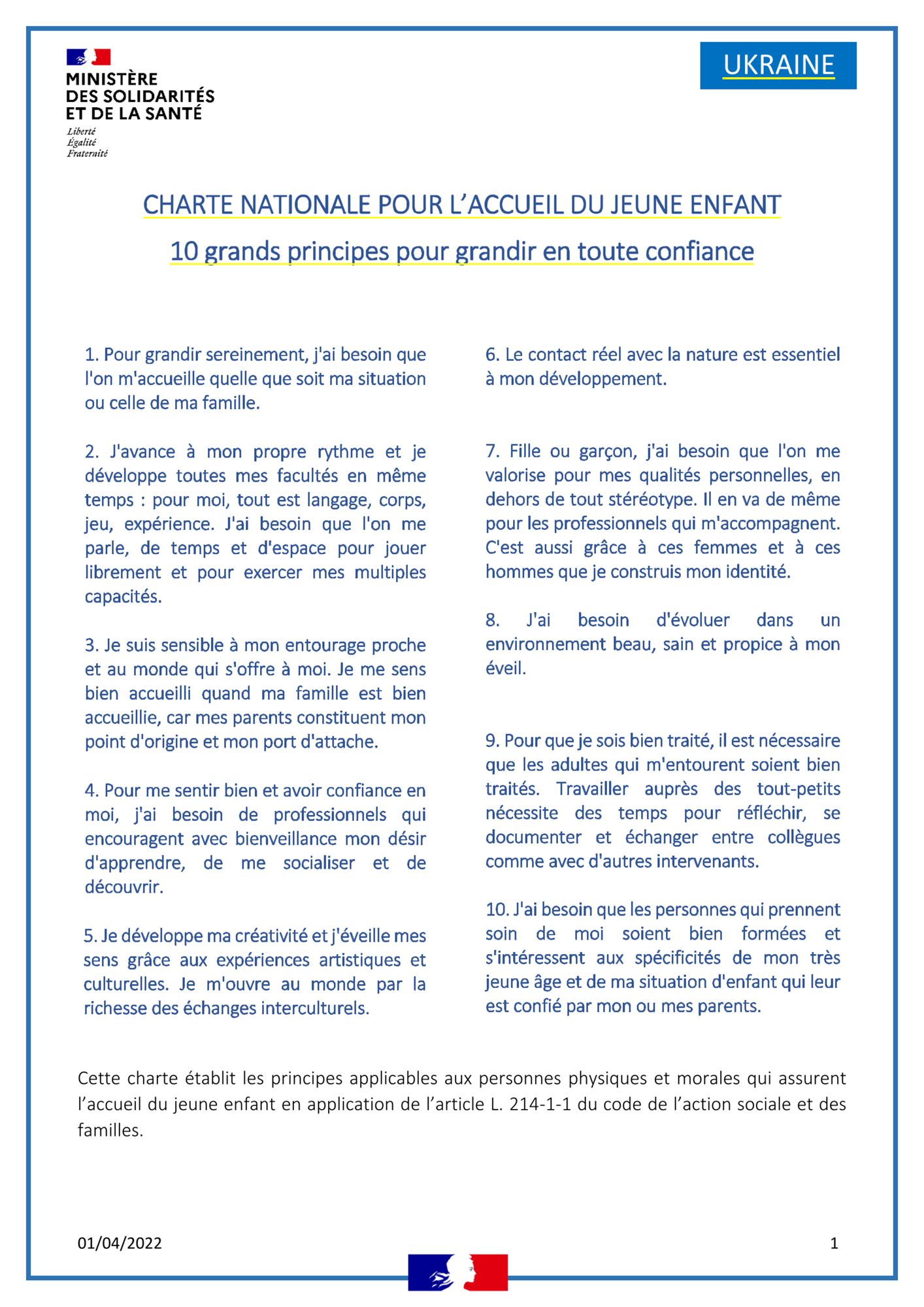 Une version multilingue de la charte nationale de l’accueil du jeune enfant a été conçue. Elle expose en français, en anglais, en ukrainien et en russe 10 grands principes pour grandir en toute confiance.