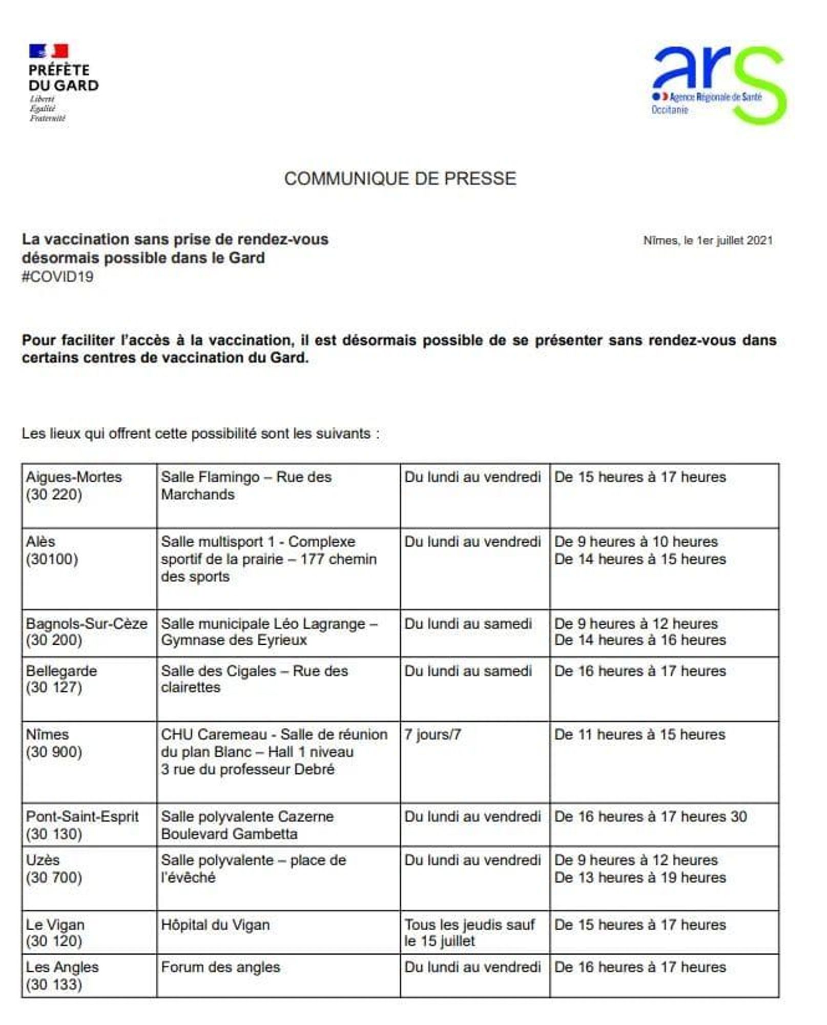 (Communiqué de presse du 1er juillet 2021 de la Préfète du Gard)