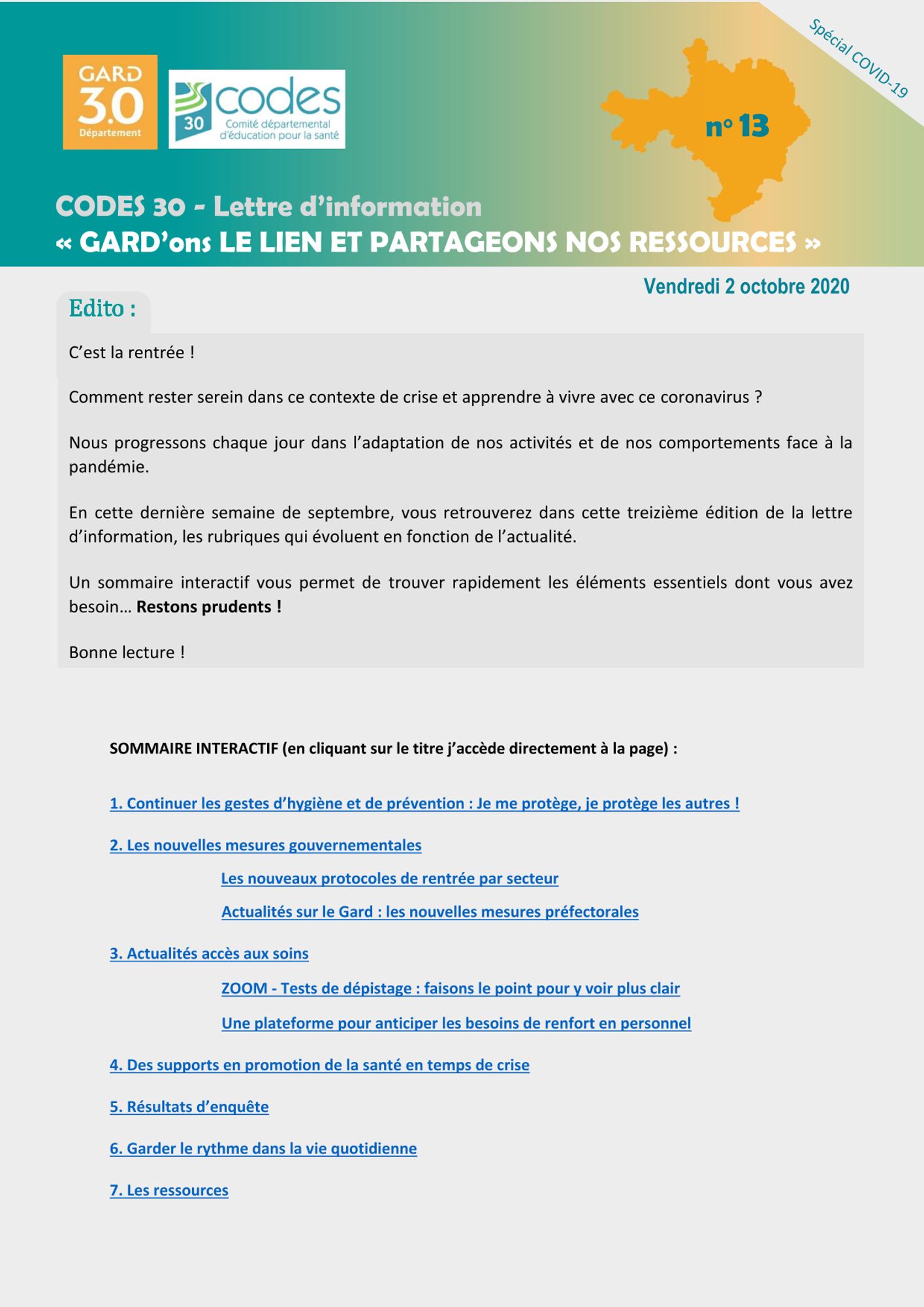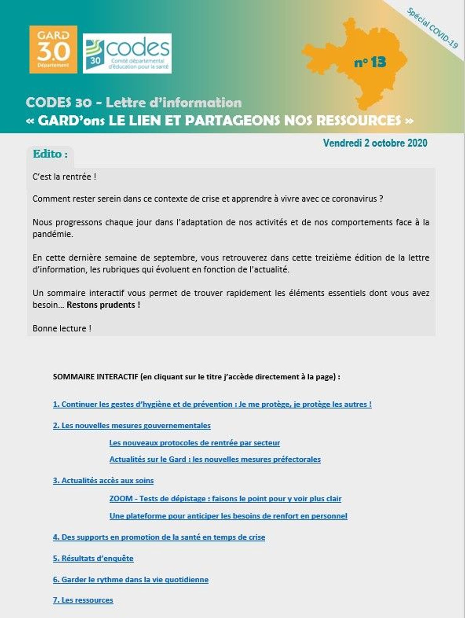 Voici l'édition numéro 13 de la lettre spéciale covid-19 "Gard'ons le lien et partageons nos ressources".