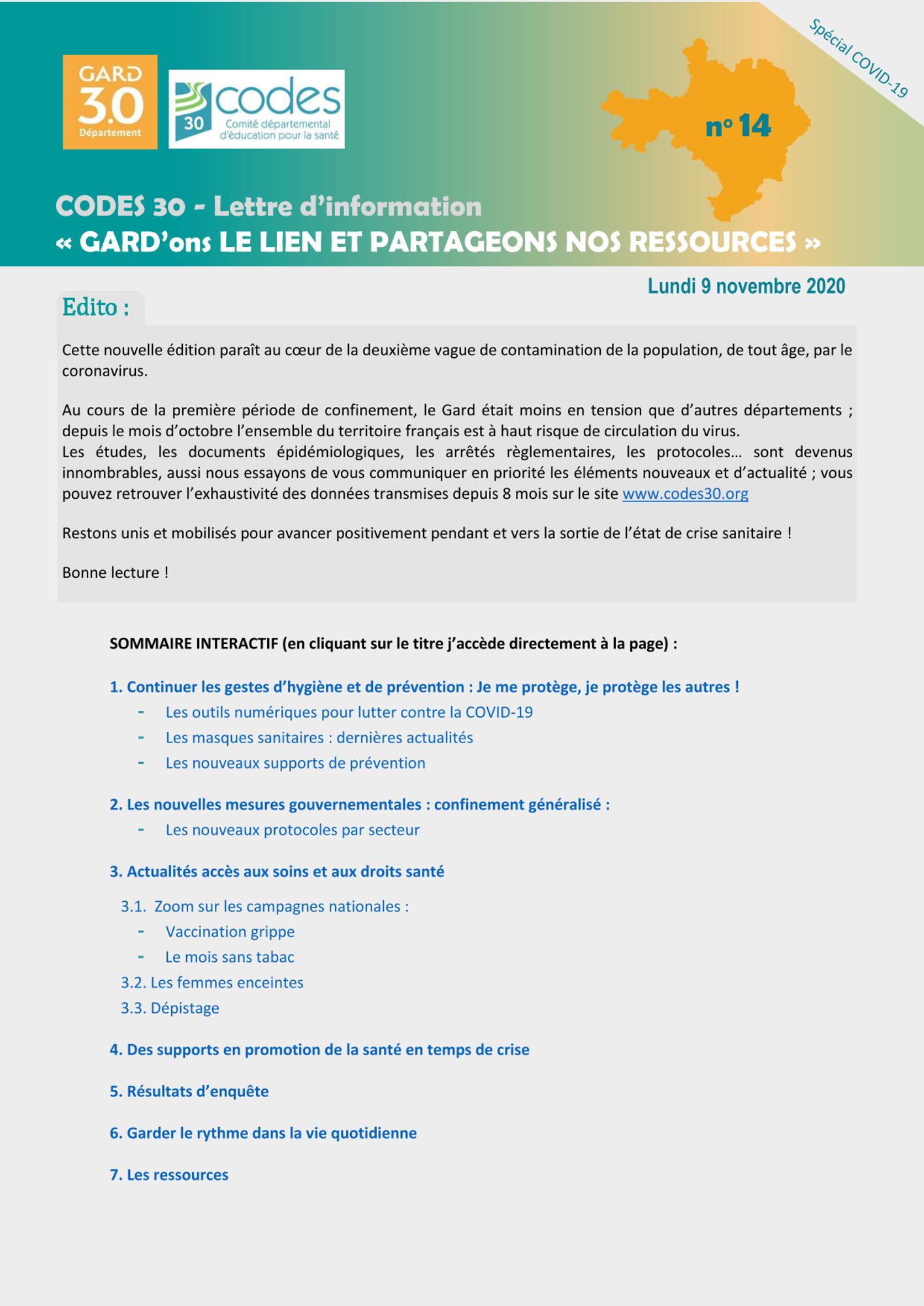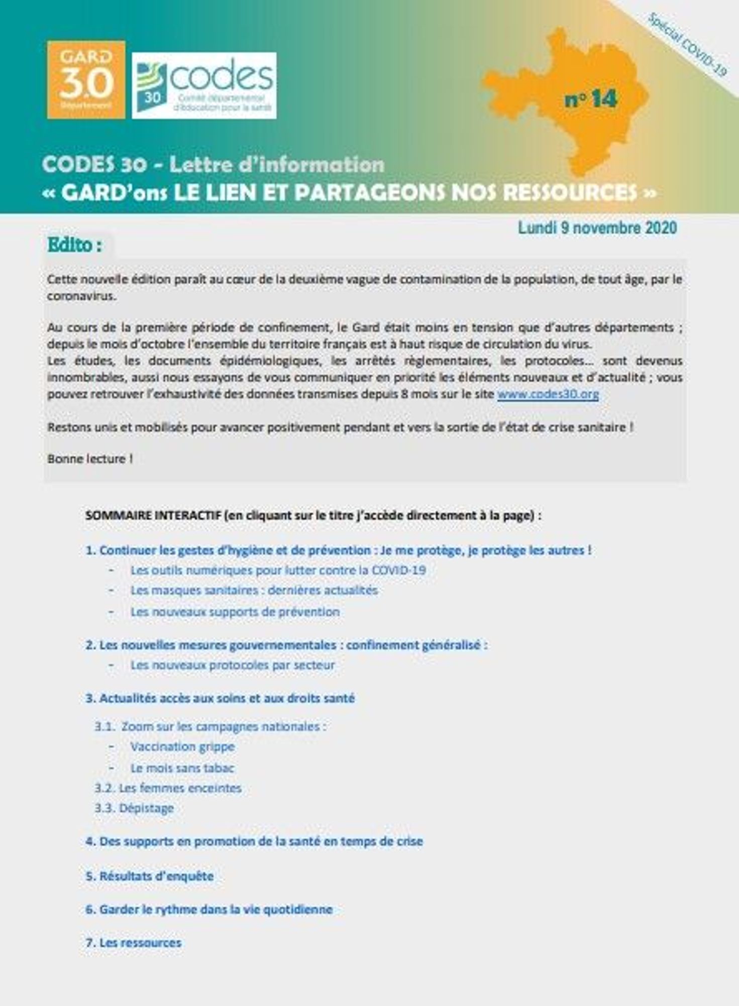 Voici l'édition numéro 14 de la lettre spéciale covid-19 "Gard'ons le lien et partageons nos ressources", qui parait dans un contexte de deuxième confinement.