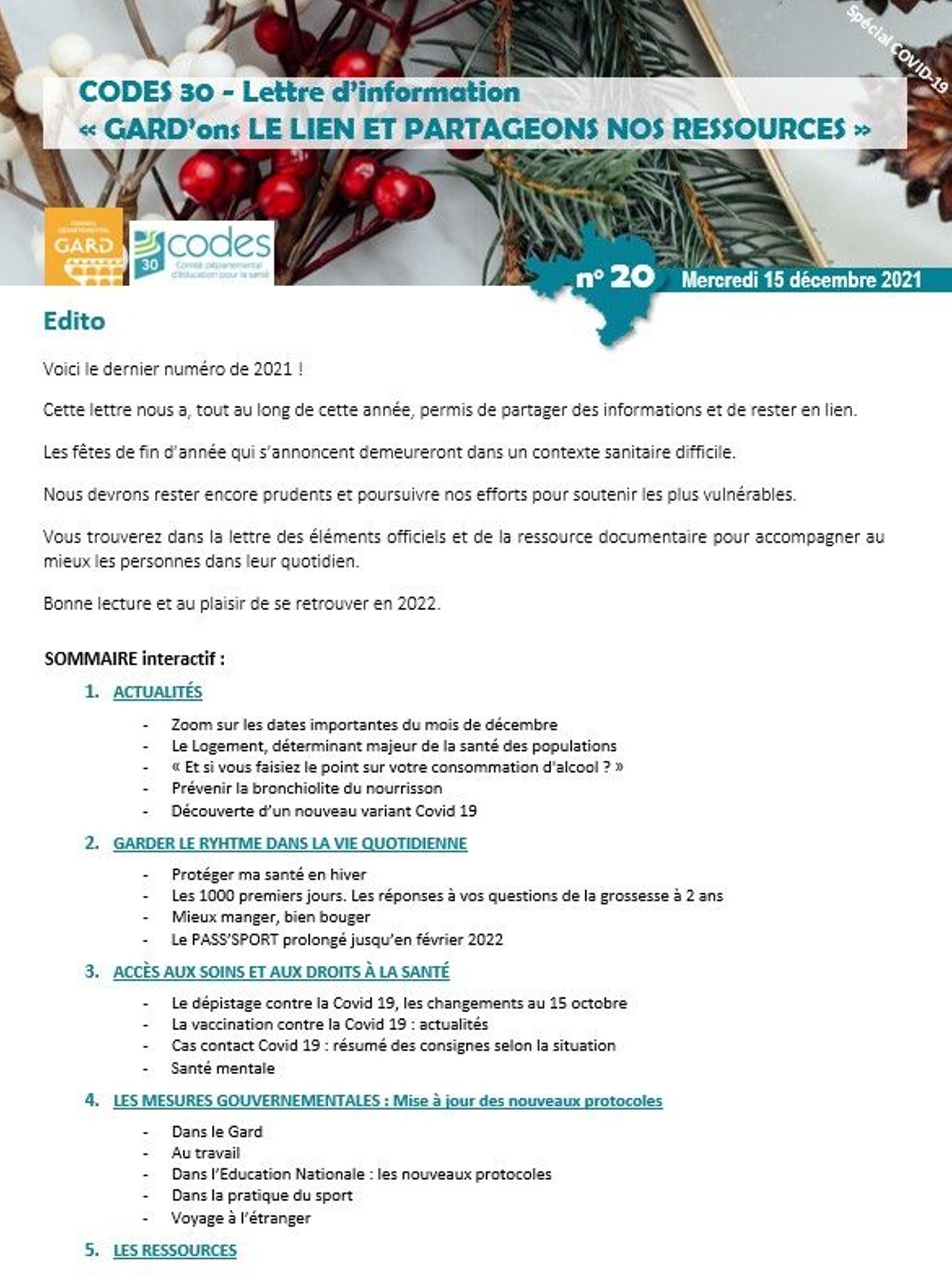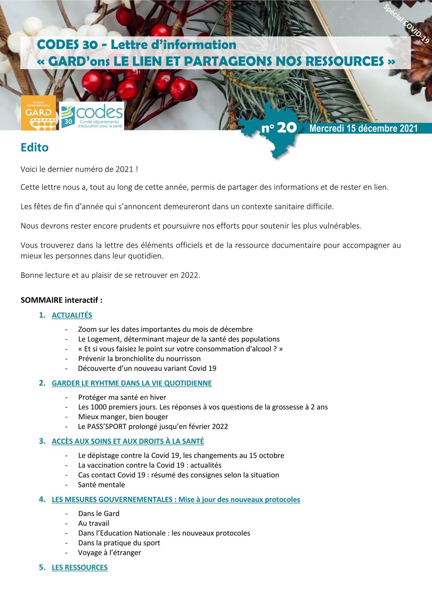 Veuillez trouver ci-joint la lettre spéciale COVID n°20.