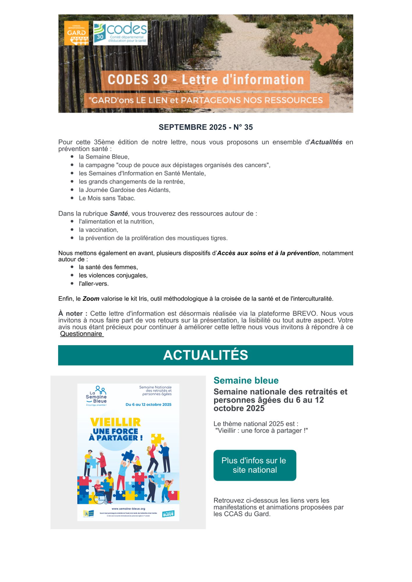 Pour cette 35ème édition de notre lettre, nous vous proposons un ensemble d'Actualités en prévention santé :