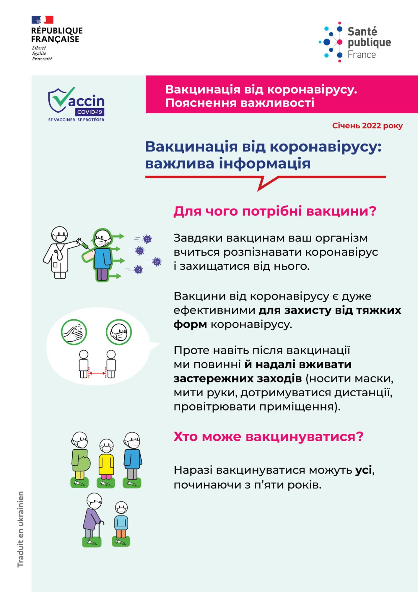 Fiche d'information en langue ukrainienne adaptée aux personnes vulnérables et notamment celles vivant en lieu de vie collectif ou habitat précaire et destinée à mieux comprendre la vaccination contre le Covid-19