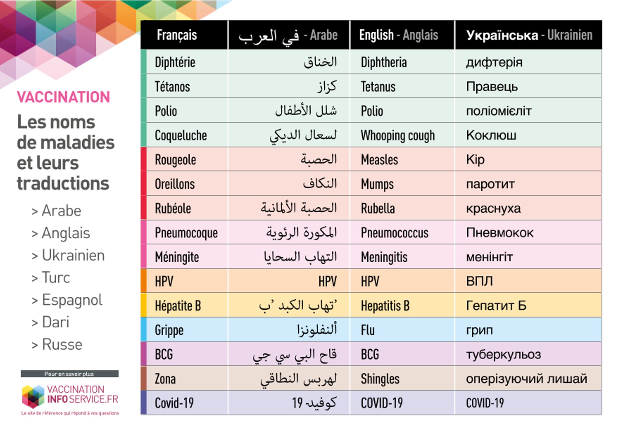 La carte postale traduit les noms de 15 maladies qui se trouvent dans le calendrier vaccinal français. [la carte peut être glissée aussi dans le carnet de vaccination ou joint à la synthèse du calendrier ] Elle a pour but d'aider la compréhension des noms des maladies à prévention vaccinale qui sont traduits en anglais, arabe, dari, espagnol, français, ukrainien, russe et turc.
