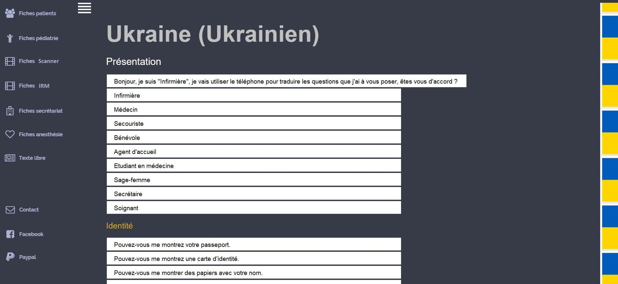 Une fois sur le pays souhaité, le menu vous proposera des fiches à imprimer pour les soins aux patients, l'imagerie, la pédiatrie, le passage au bloc opératoire, ...