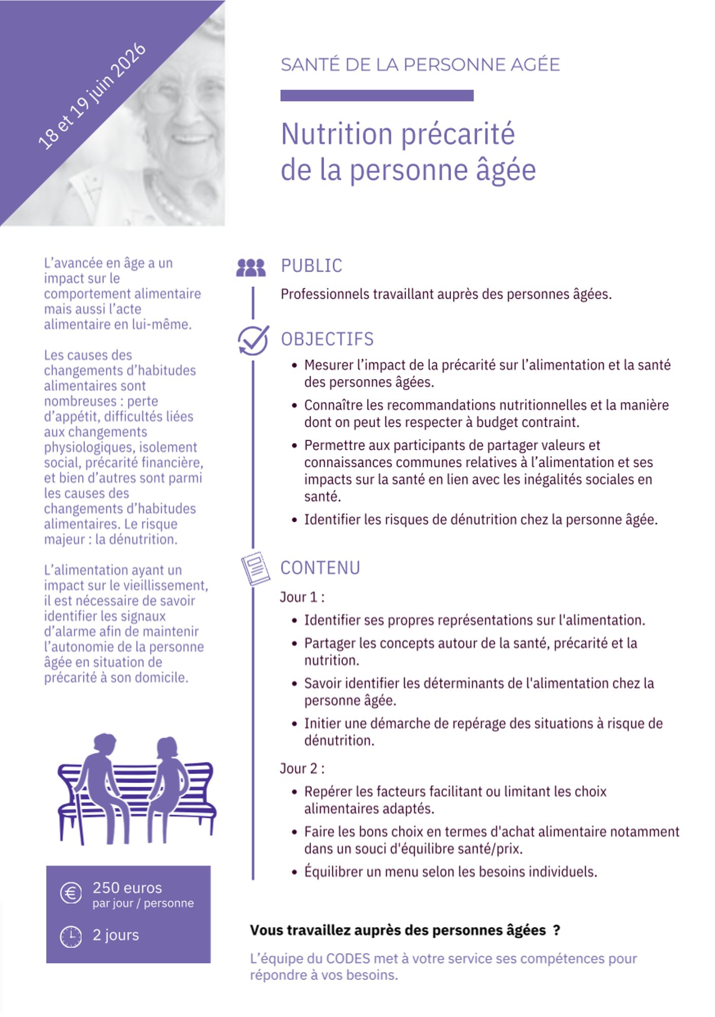 L’alimentation ayant un impact sur le vieillissement, il est nécessaire de savoir identifier les signaux d’alarme afin de maintenir l’autonomie de la personne âgée en situation de précarité à son domicile.