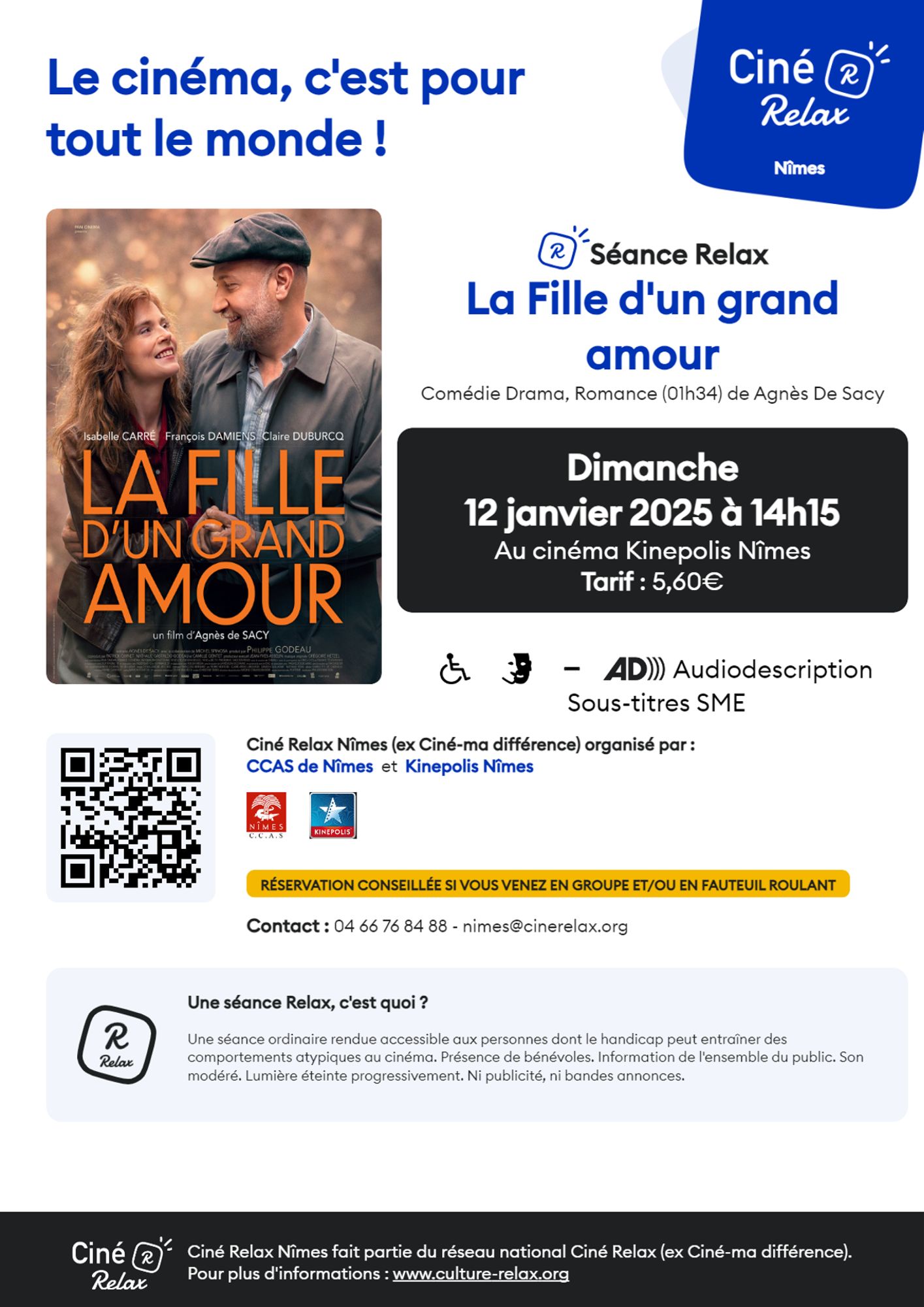 Le CCAS de Nîmes, en lien avec Madame Véronique JOUVE-SAMMUT - Conseillère déléguée aux Handicaps et à l’Accessibilité, a le plaisir de vous communiquer la date de la prochaine séance "Ciné Relax" programmée au Cinéma Le KINEPOLIS