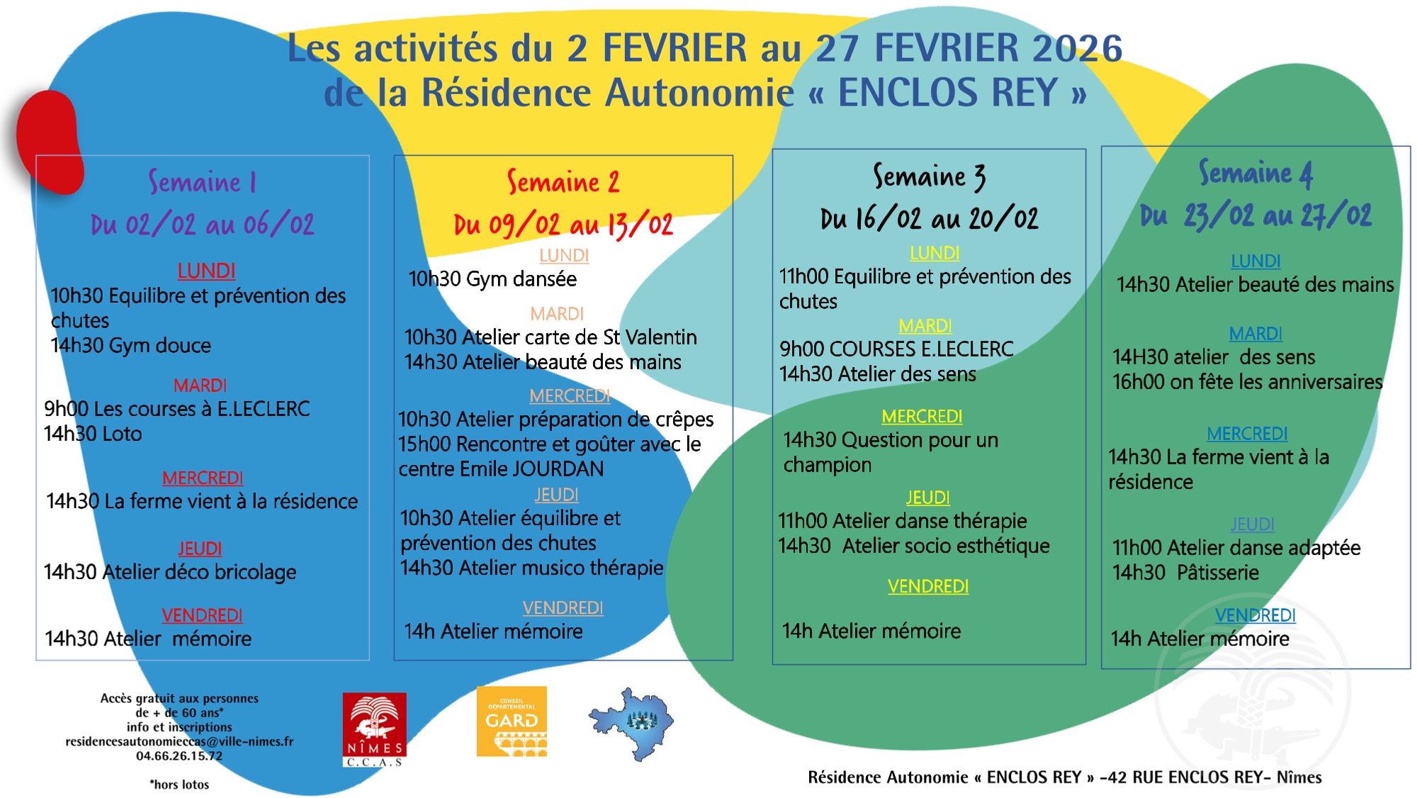Retrouvez en téléchargement en bas de page le planning des animations qui se dérouleront au mois de FÉVRIER à la Résidence autonomie « Enclos Rey ».