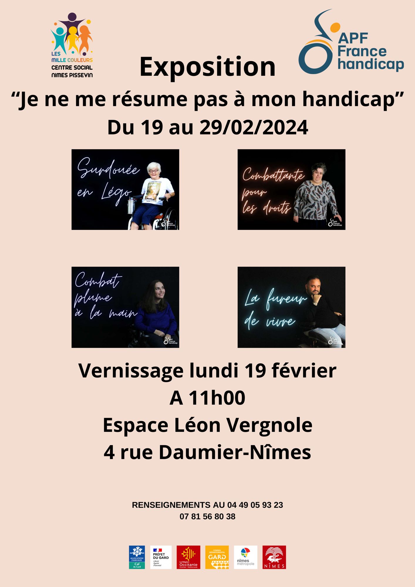 En partenariat avec l'association APF France Handicap, le centre social Les Mille Couleurs est heureux de vous convier au vernissage de l'exposition "Je ne me résume pas à mon handicap"