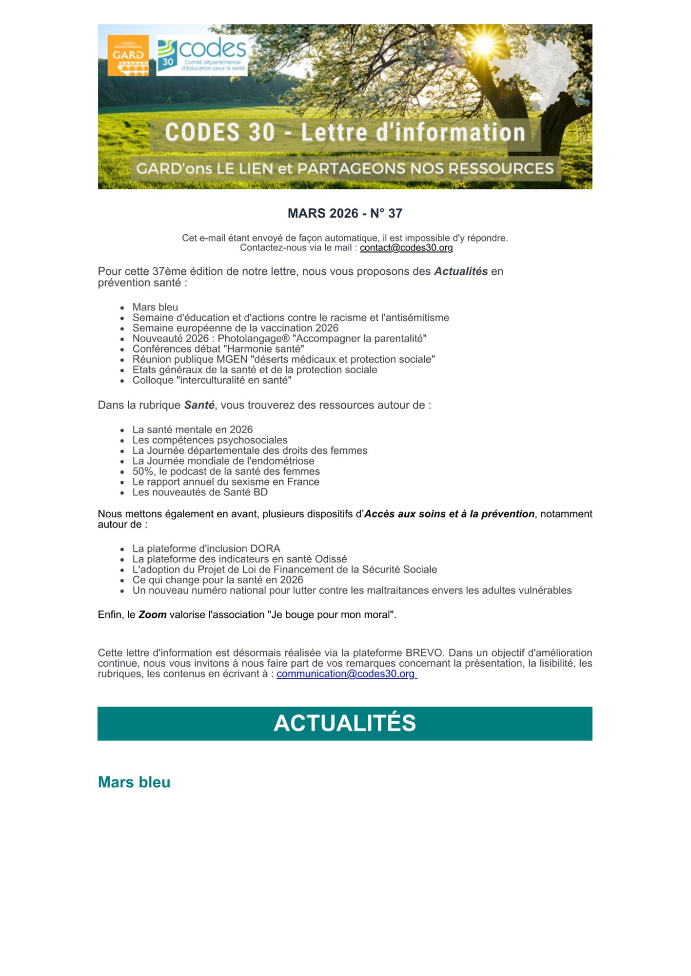 Pour cette 37ème édition de notre lettre, nous vous proposons des Actualités en prévention santé :