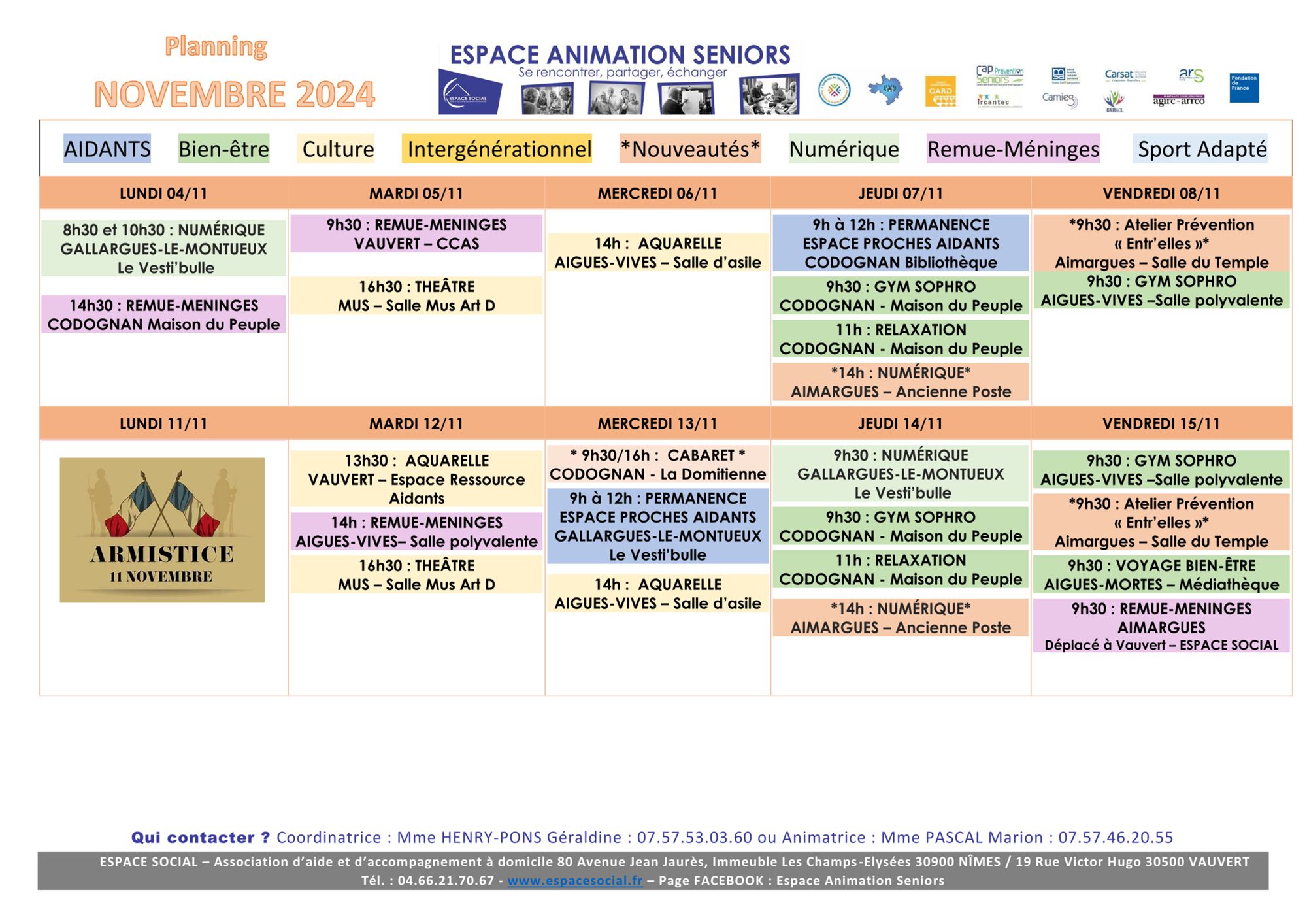 ESPACE SOCIAL organise des actions collectives avec les partenaires locaux (mairies, CCAS, CMS…) sur différentes communes : Le Grau-du-Roi, Aigues-Mortes, Saint-Laurent-d’Aigouze, Aimargues, Le Cailar, Gallargues-le-Montueux. Aigues-Vives, Mus, Codognan et Vauvert (Planning en téléchargement en bas de page).