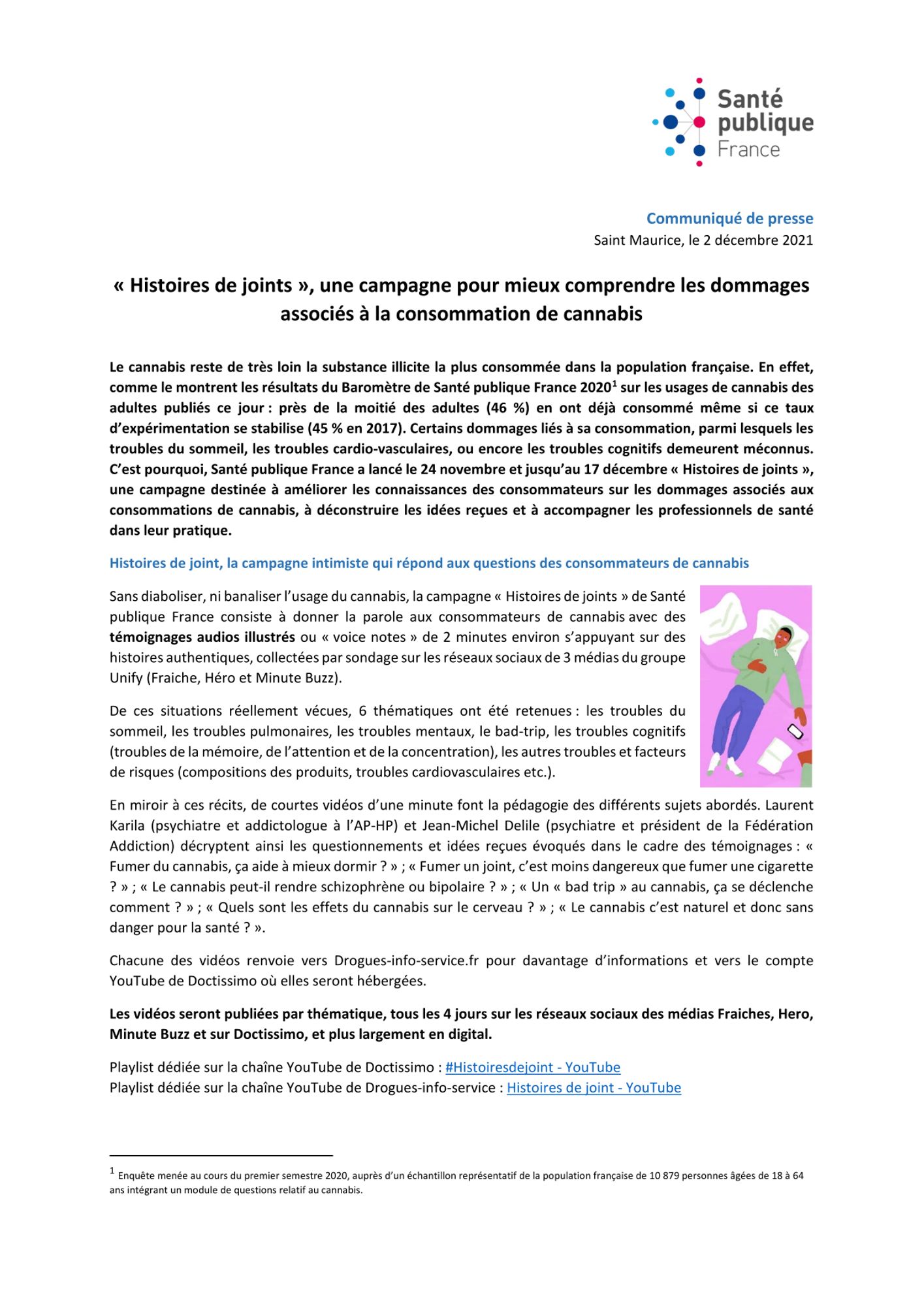 Sans diaboliser, ni banaliser l’usage du cannabis, la campagne « Histoires de joints » de Santé publique France consiste à donner la parole aux consommateurs de cannabis avec des témoignages audios illustrés ou « voice notes » de 2 minutes environ s’appuyant sur des histoires authentiques, collectées par sondage sur les réseaux sociaux de 3 médias du groupe Unify (Fraiche, Héro et Minute Buzz).