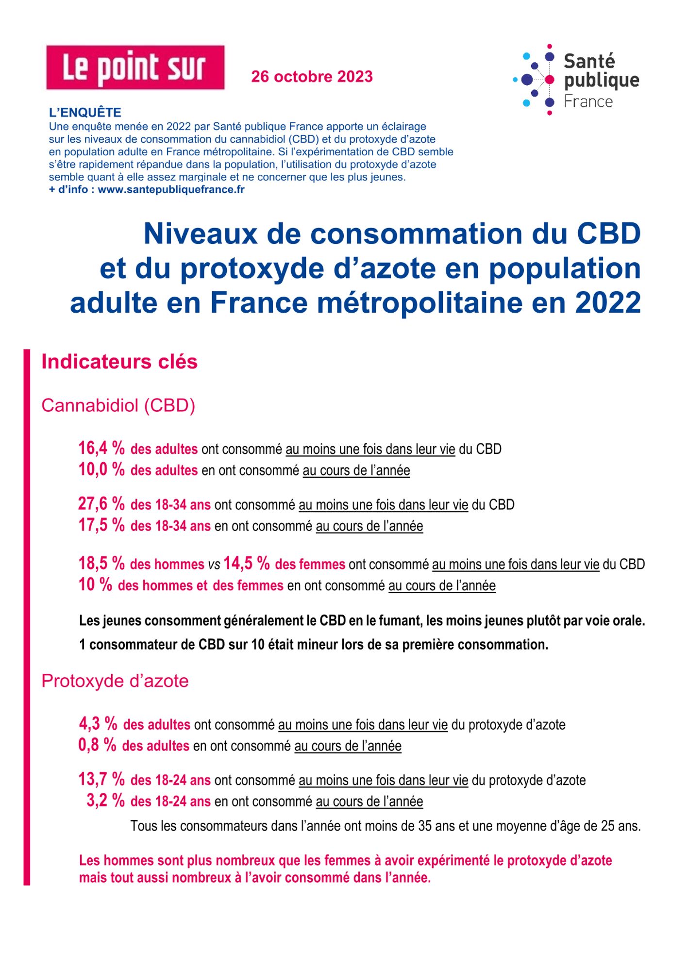Santé publique France a publié au mois d'octobre 2023 des résultats inédits sur les niveaux de consommation de CBD et protoxyde d’azote chez la population adulte française et les profils des consommateurs en 2022.