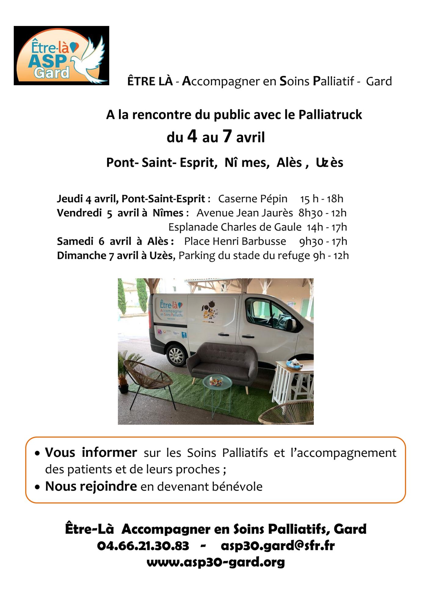 Venez rencontrer les bénévoles de l'association Être-là ASP Gard (bénévoles d'accompagnement de personnes en soins palliatifs) en tournée avec le "PALLIATRUCK"