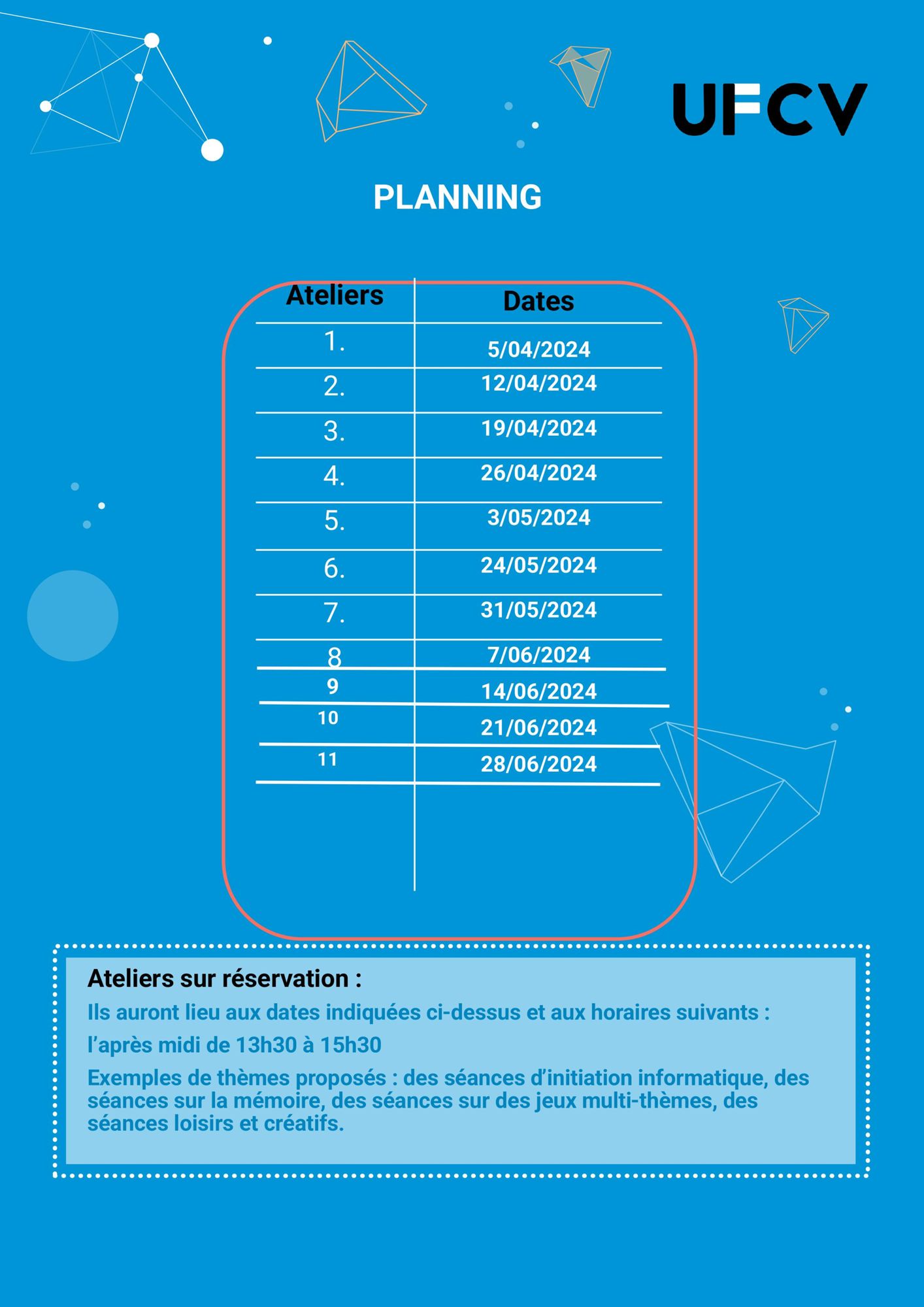 Le programme des ateliers se construit avec le groupe au fur et à mesure mais les thèmes généraux sont principalement axés : sur l’initiation à l’informatique, sur le bien-être, comment bien vieillir et sur des activités manuelles et de loisirs.