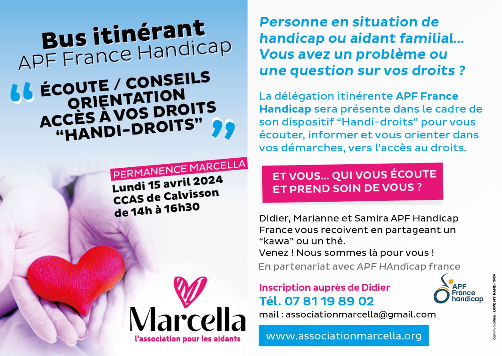 La délégation itinérante APF France Handicap sera présente à la permanence Marcella dans le cadre de son dispositif « Handi-droits » pour vous écouter, informer et vous orienter dans vos démarches, vers l’accès aux droits.