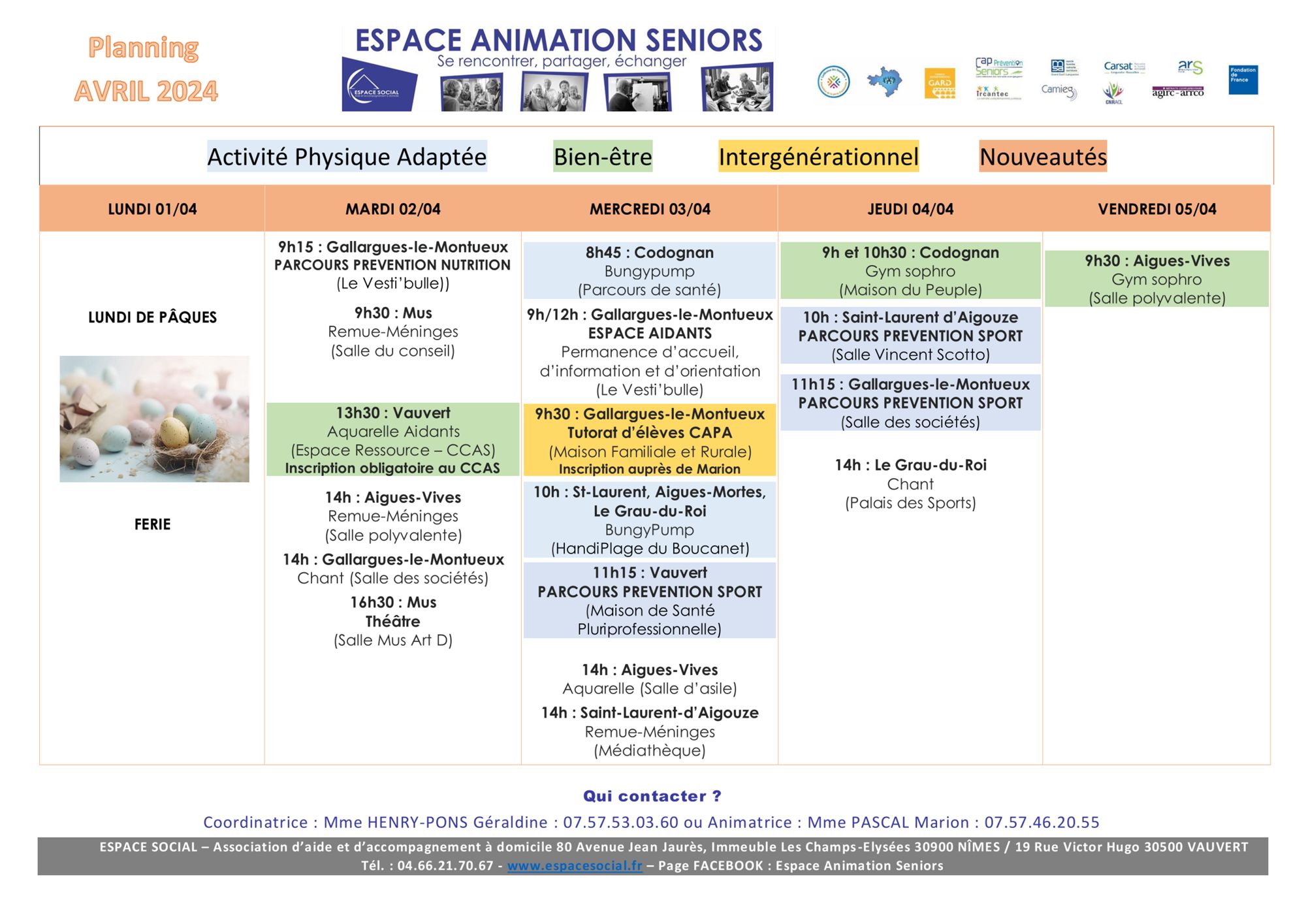 ESPACE SOCIAL organise des actions collectives avec les partenaires locaux (mairies, CCAS, CMS…) sur différentes communes : Le Grau-du-Roi, Aigues-Mortes, Saint-Laurent-d’Aigouze, Aimargues, Le Cailar et Gallargues-le-Montueux. Aigues-Vives, Mus, Codognan (Planning en téléchargement en bas de page).