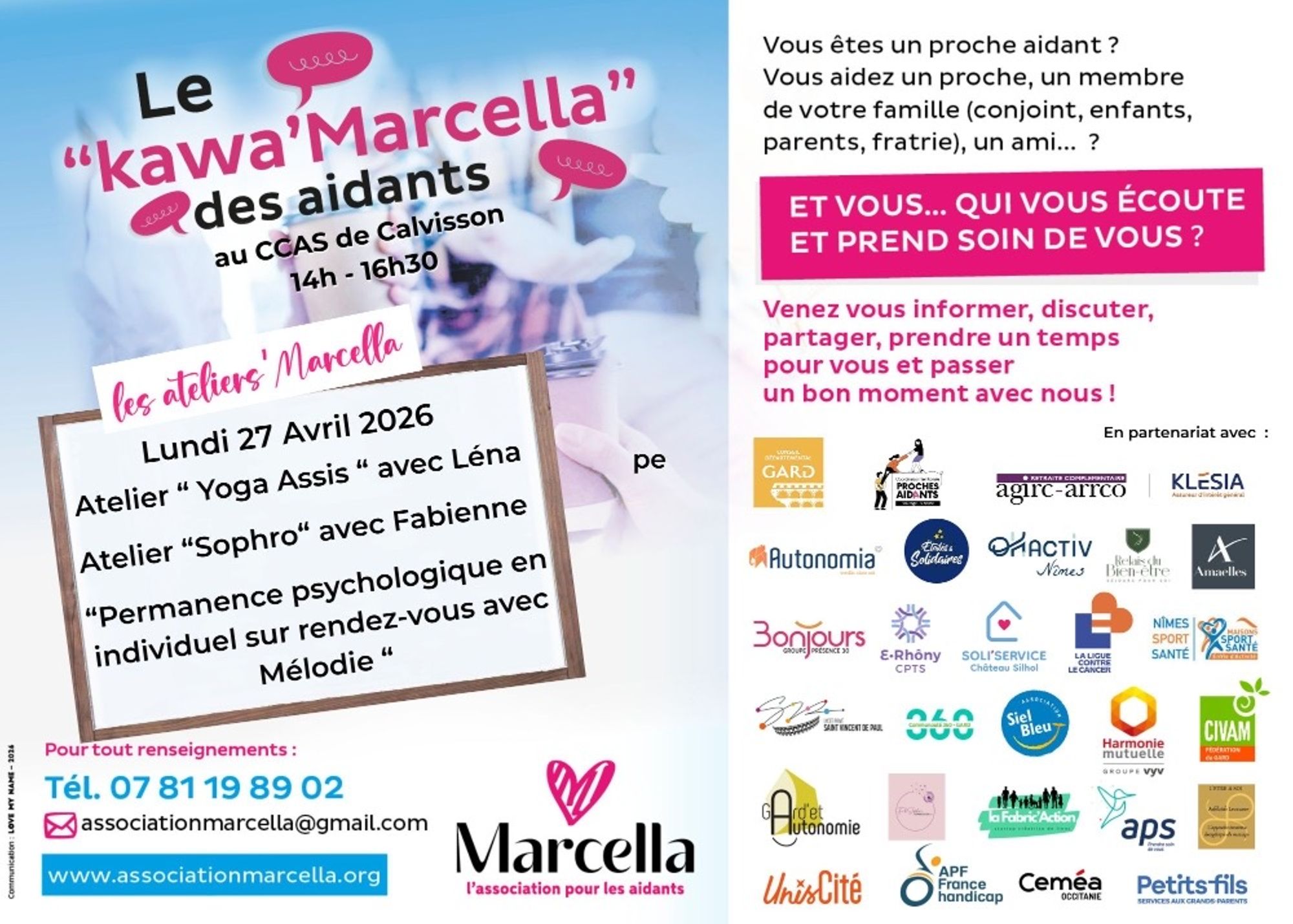 Ateliers Yoga assis et Sophrologie Lundi 27 avril 2026 - Calvisson Lundi 27 avril 2026de 14h à 16h30au CCAS de Calvisson Pour tout renseignement :Tél. : 07 81 19 89 02Mail : associationmarcella@gmail.comSite : https://associationmarcella.org/ Télécharger le flyer de l’Espace Ressources Aidants du territoire de Vaunage - Vidourle (111.4 Ko)
