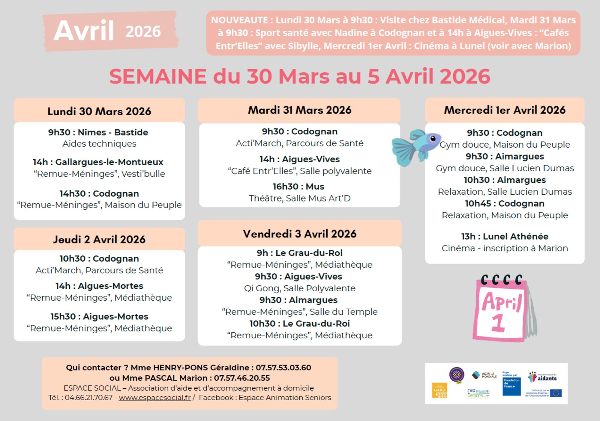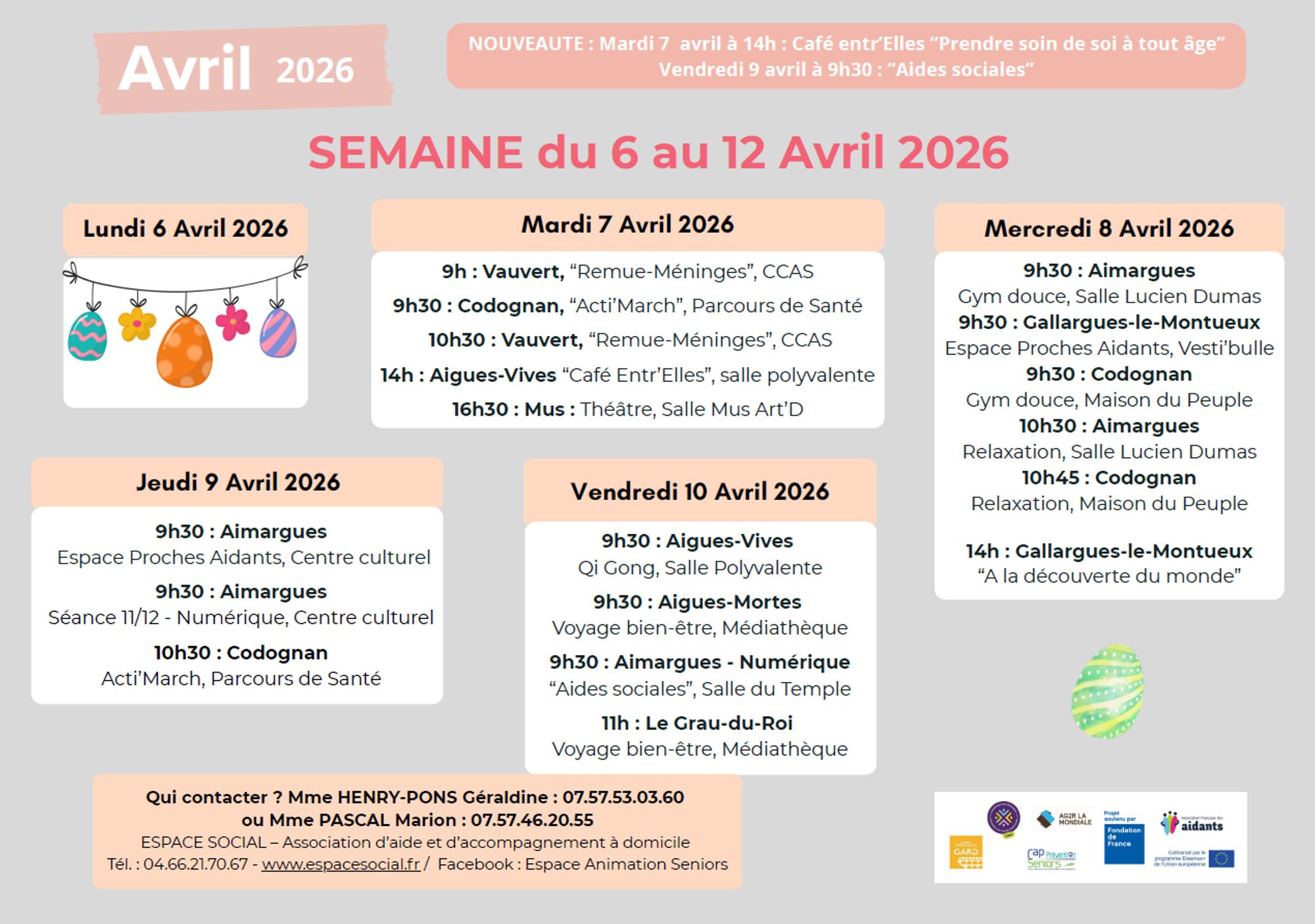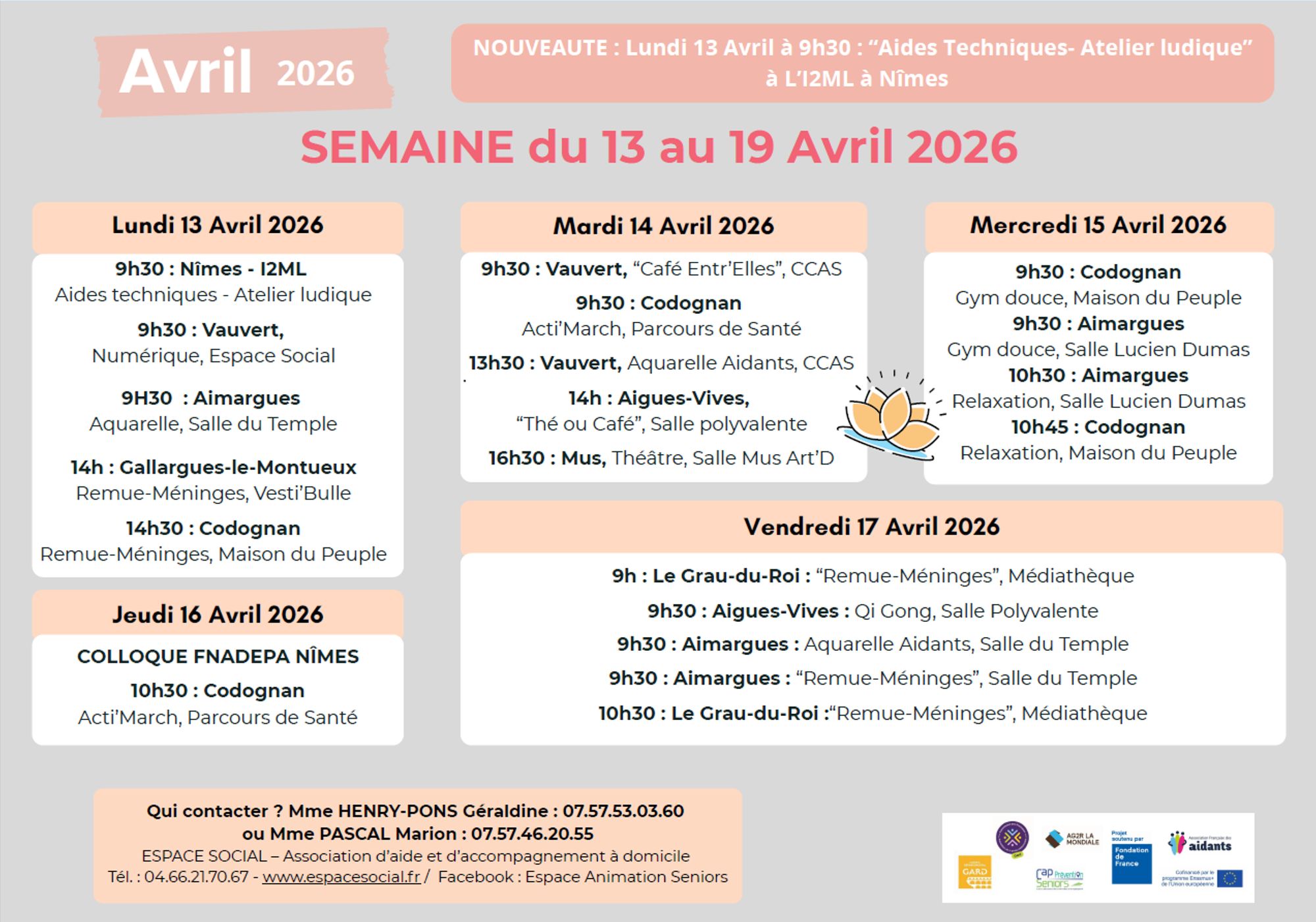 ESPACE SOCIAL organise des actions collectives avec les partenaires locaux (mairies, CCAS, CMS…) sur différentes communes : Le Grau-du-Roi, Aigues-Mortes, Saint-Laurent-d’Aigouze, Aimargues, Le Cailar, Gallargues-le-Montueux. Aigues-Vives, Mus, Codognan et Vauvert (Planning en téléchargement en bas de page).
