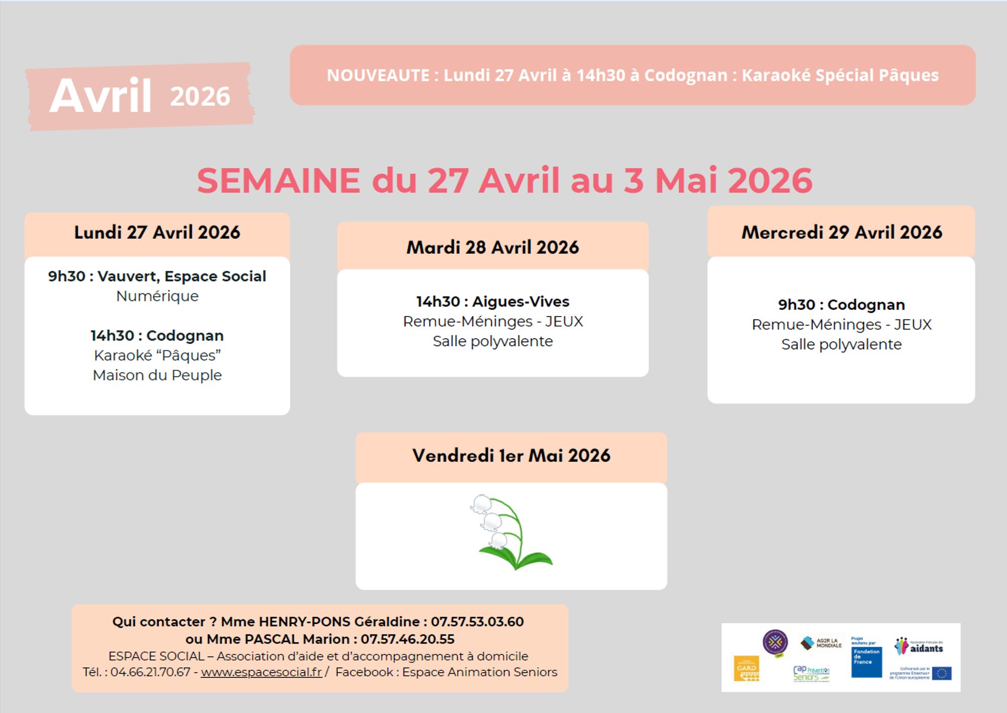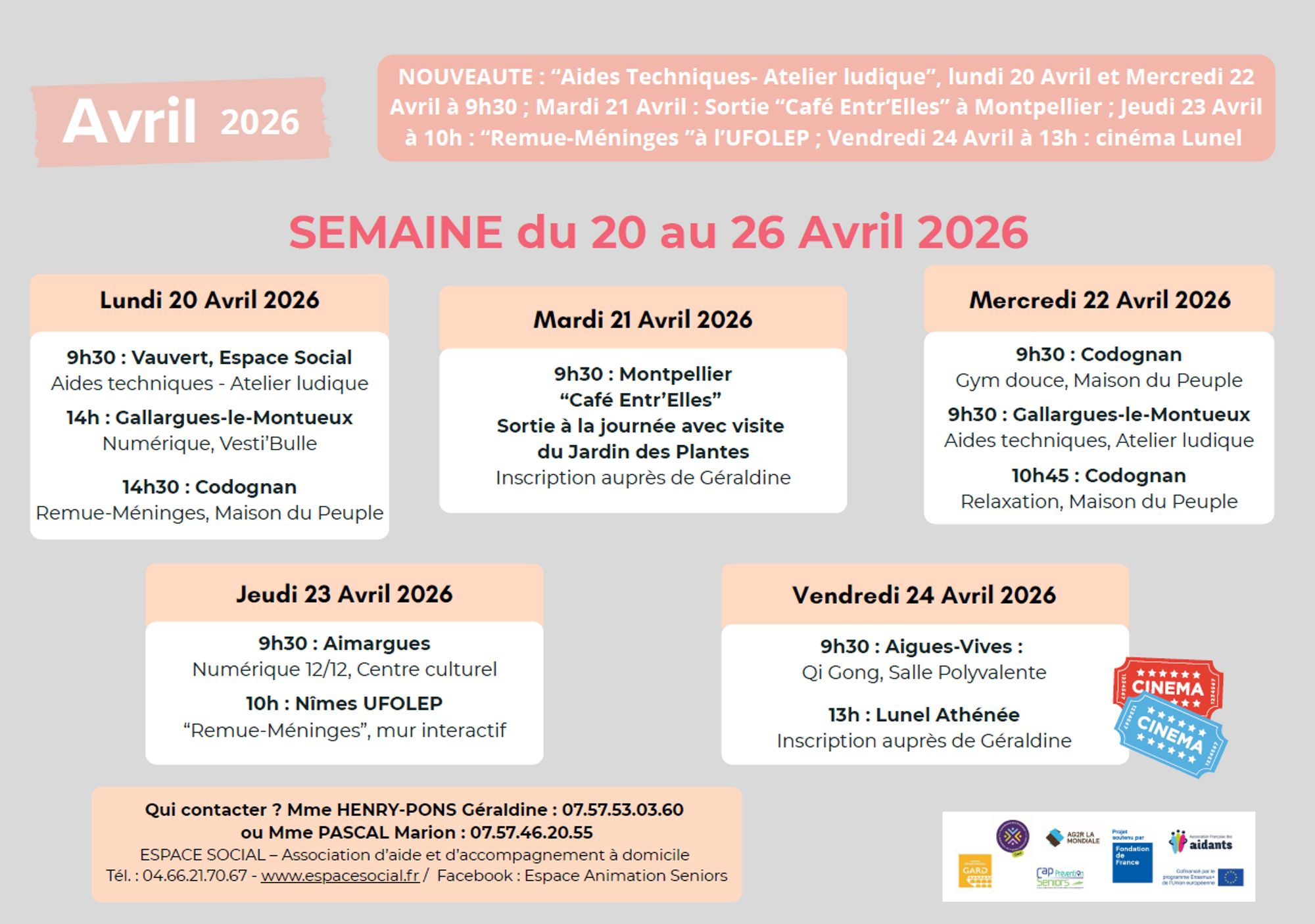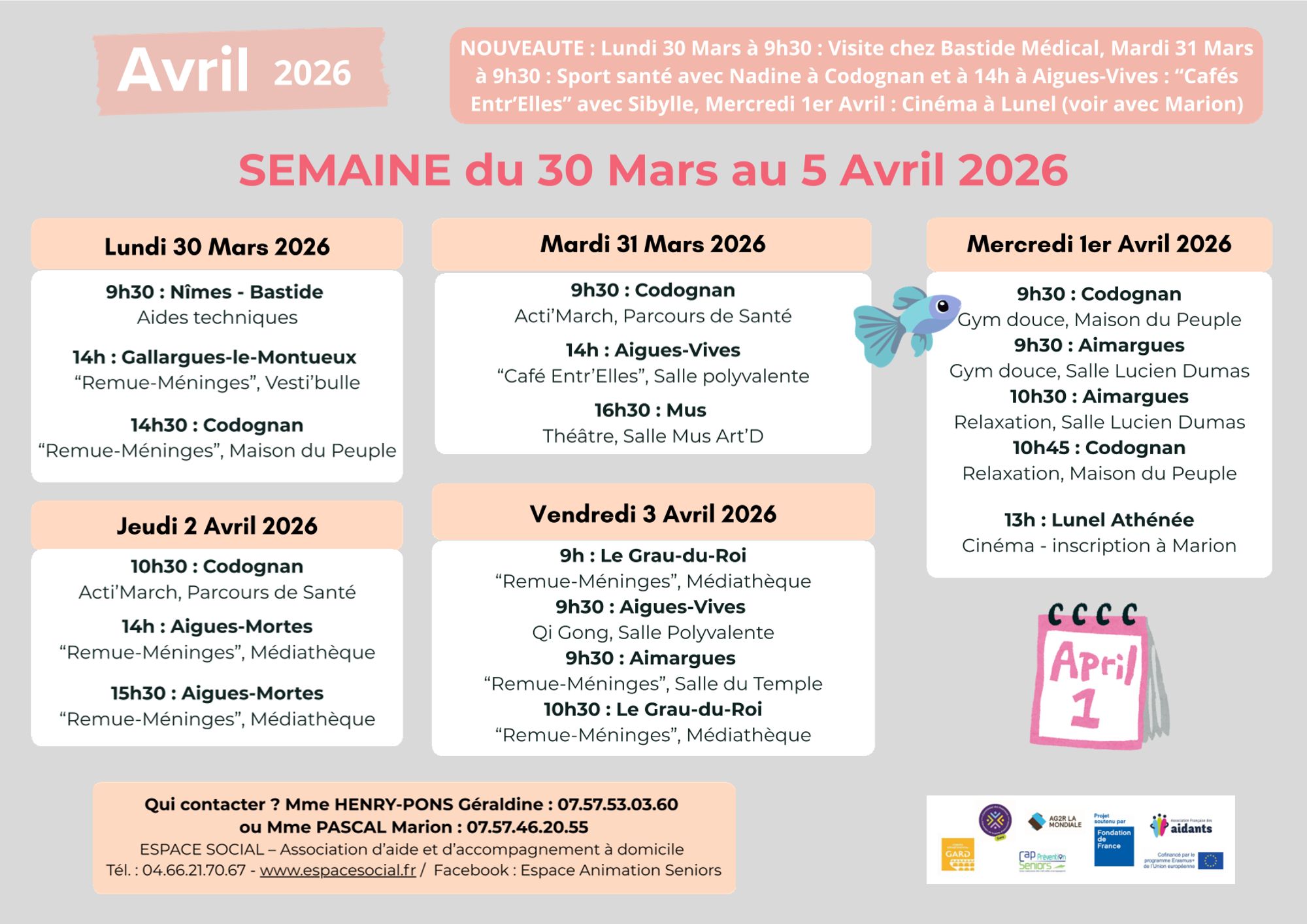 ESPACE SOCIAL organise des actions collectives avec les partenaires locaux (mairies, CCAS, CMS…) sur différentes communes : Le Grau-du-Roi, Aigues-Mortes, Saint-Laurent-d’Aigouze, Aimargues, Le Cailar, Gallargues-le-Montueux. Aigues-Vives, Mus, Codognan et Vauvert (Planning en téléchargement en bas de page).