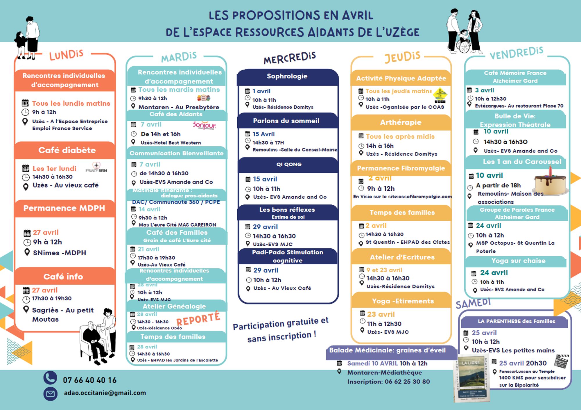 Retrouvez ci-dessous les activités du mois de MARS de l'Espace Ressources Aidants de l'Uzège.