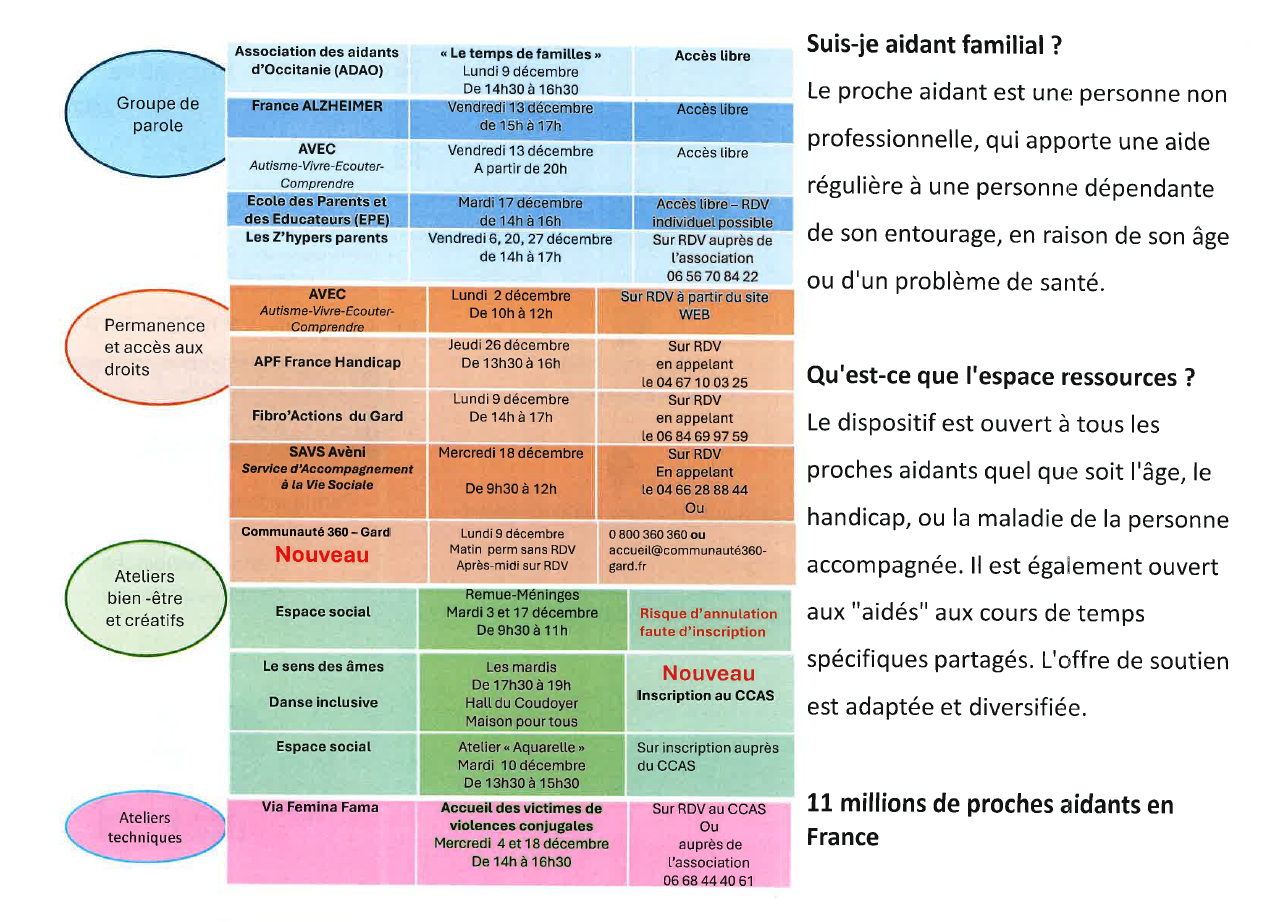 Le CCAS de Vauvert propose un espace ressources convivial pour trouver du soutien et accompagner celles et ceux aidant des personnes en situation de handicap (parent ou enfant) ou d’un enfant difficile à comprendre ou d’un parent en perte d’autonomie. Cet espace confortable et en accès libre propose aussi des permanences, des groupes de parole et des ateliers. Voici les permanences qui s’y dérouleront au mois de décembre à l’attention des aidants