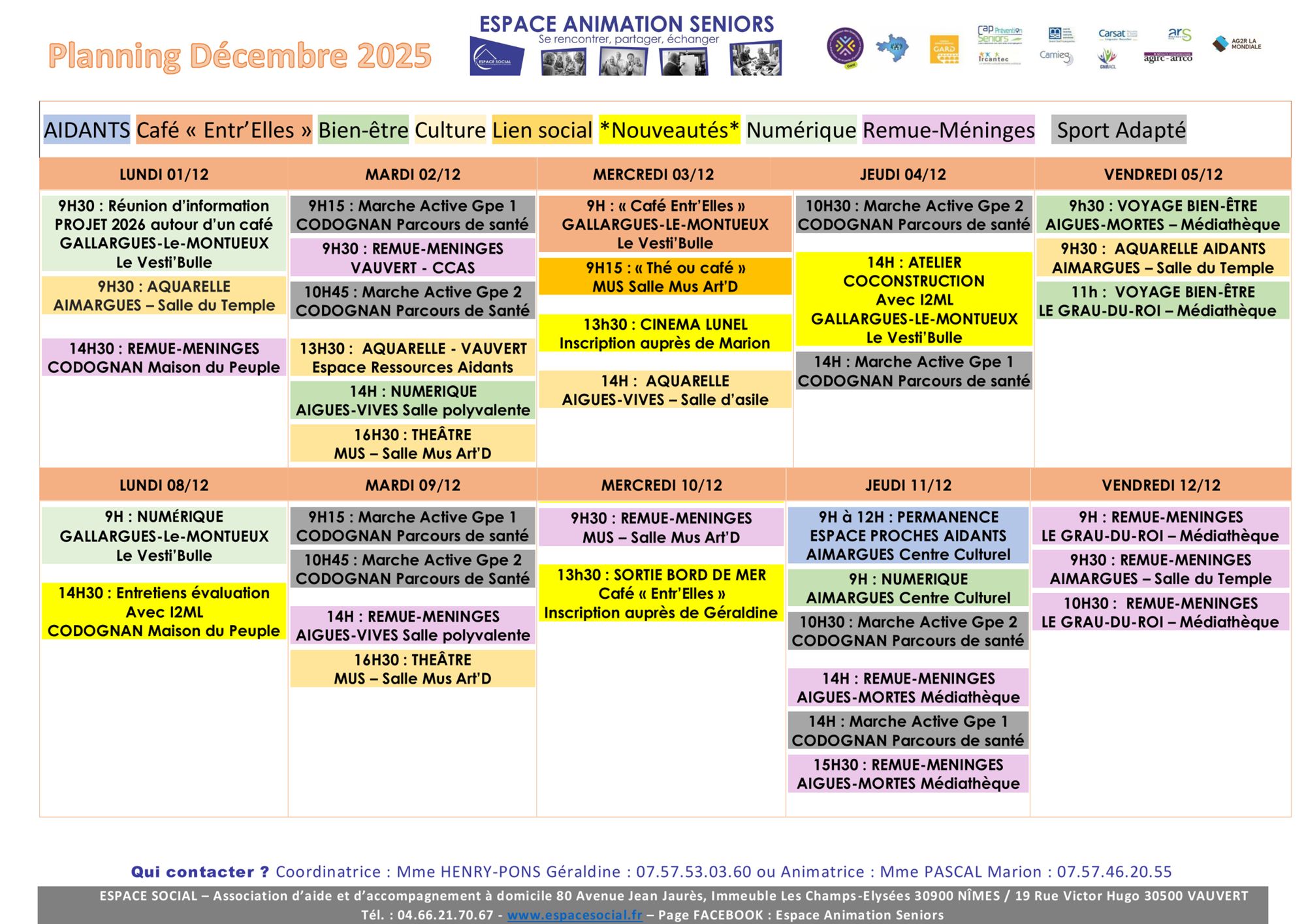 ESPACE SOCIAL organise des actions collectives avec les partenaires locaux (mairies, CCAS, CMS…) sur différentes communes : Le Grau-du-Roi, Aigues-Mortes, Saint-Laurent-d’Aigouze, Aimargues, Le Cailar, Gallargues-le-Montueux. Aigues-Vives, Mus, Codognan et Vauvert (Planning en téléchargement en bas de page).
