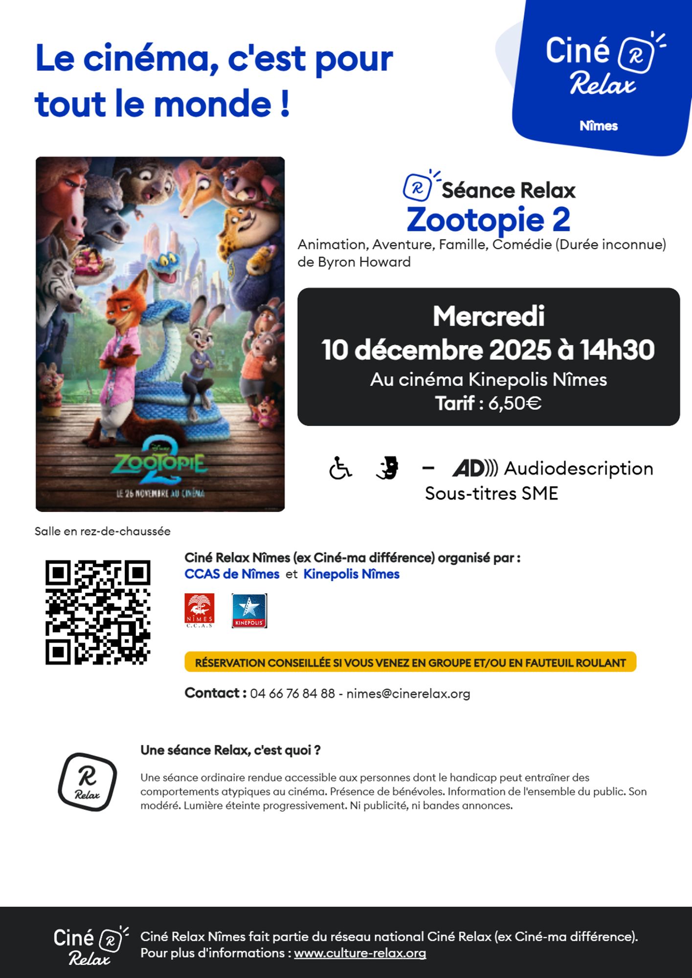 Le CCAS de Nîmes, en lien avec Madame Mylène MOUTON adjointe déléguée à l'Egalité, au Droit des Femmes, aux Handicaps, à la Lutte contre les Discriminations et à l'Aide aux Victimes, a le plaisir de vous communiquer la date de la prochaine séance "Ciné Relax" programmée au Cinéma Le KINEPOLIS