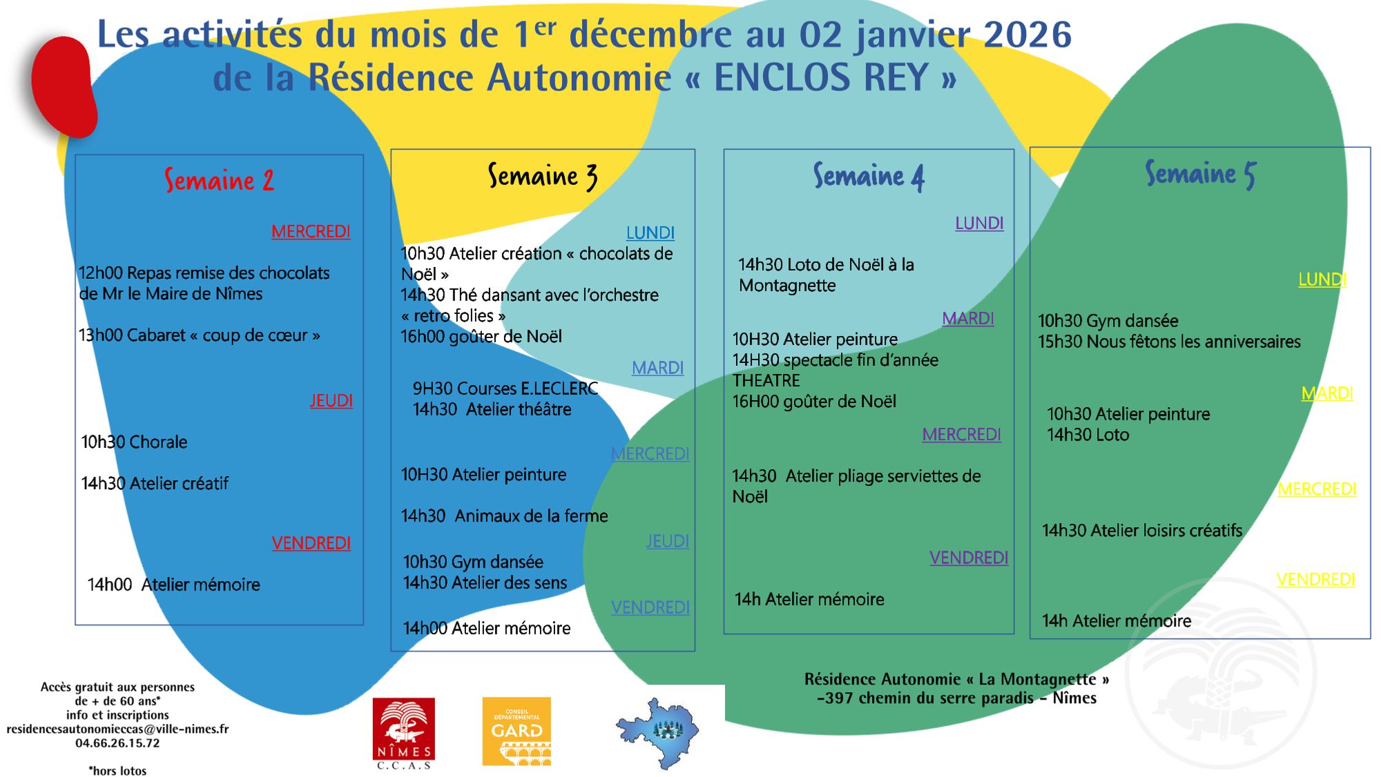 Retrouvez en téléchargement en bas de page le planning des animations qui se dérouleront au mois de décembre à la Résidence autonomie « Enclos Rey ».