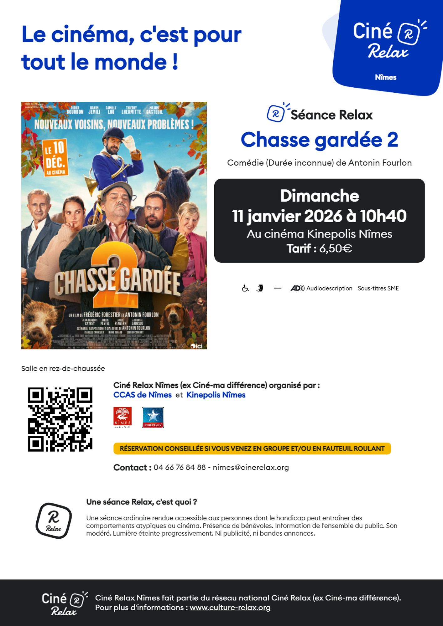 Le CCAS de Nîmes, en lien avec Madame Mylène MOUTON adjointe déléguée à l'Egalité, au Droit des Femmes, aux Handicaps, à la Lutte contre les Discriminations et à l'Aide aux Victimes, a le plaisir de vous communiquer la date de la prochaine séance "Ciné Relax" programmée au Cinéma Le KINEPOLIS