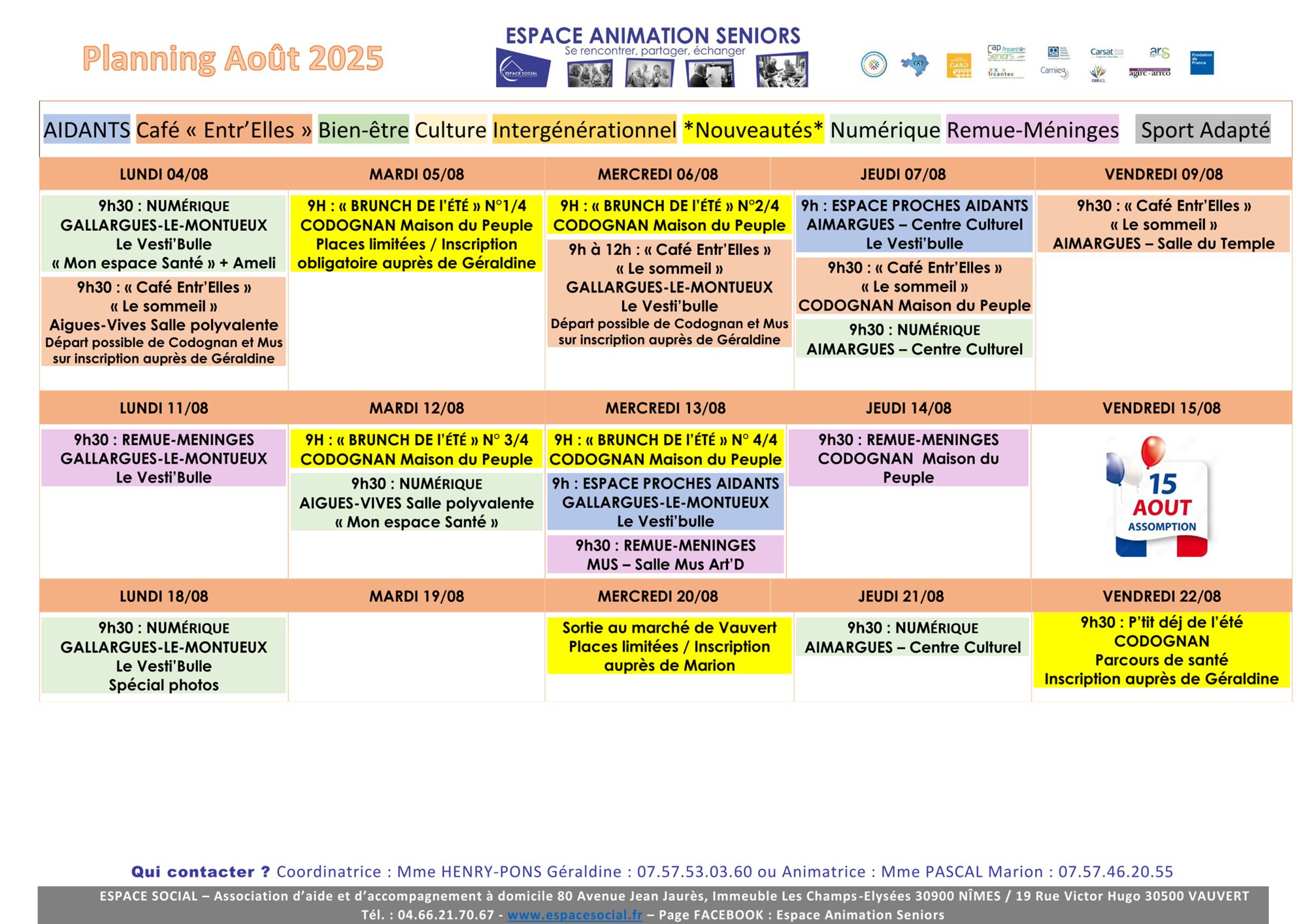 ESPACE SOCIAL organise des actions collectives avec les partenaires locaux (mairies, CCAS, CMS…) sur différentes communes : Le Grau-du-Roi, Aigues-Mortes, Saint-Laurent-d’Aigouze, Aimargues, Le Cailar, Gallargues-le-Montueux. Aigues-Vives, Mus, Codognan et Vauvert (Planning en téléchargement en bas de page).