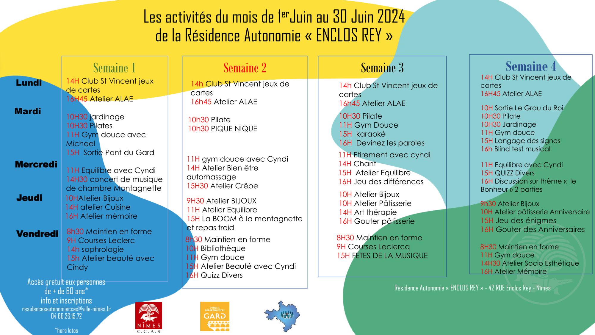 Retrouvez en téléchargement en bas de page le planning des animations qui se dérouleront au mois de juin à la Résidence autonomie « Enclos Rey ».