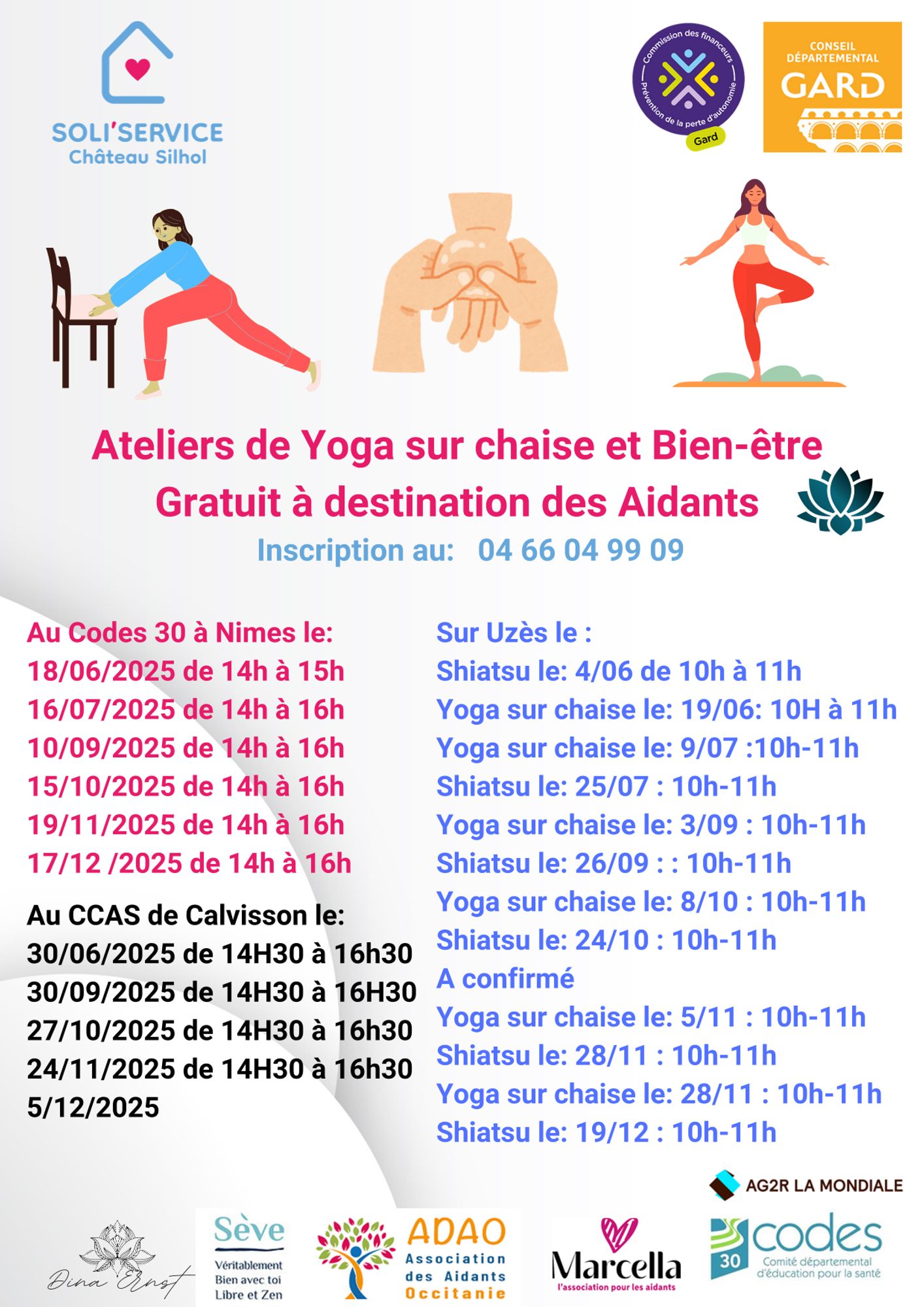 SOLI'SERVICE Château Silhol propose des ateliers de Yoga sur chaise et bien-être à destination des aidants.
