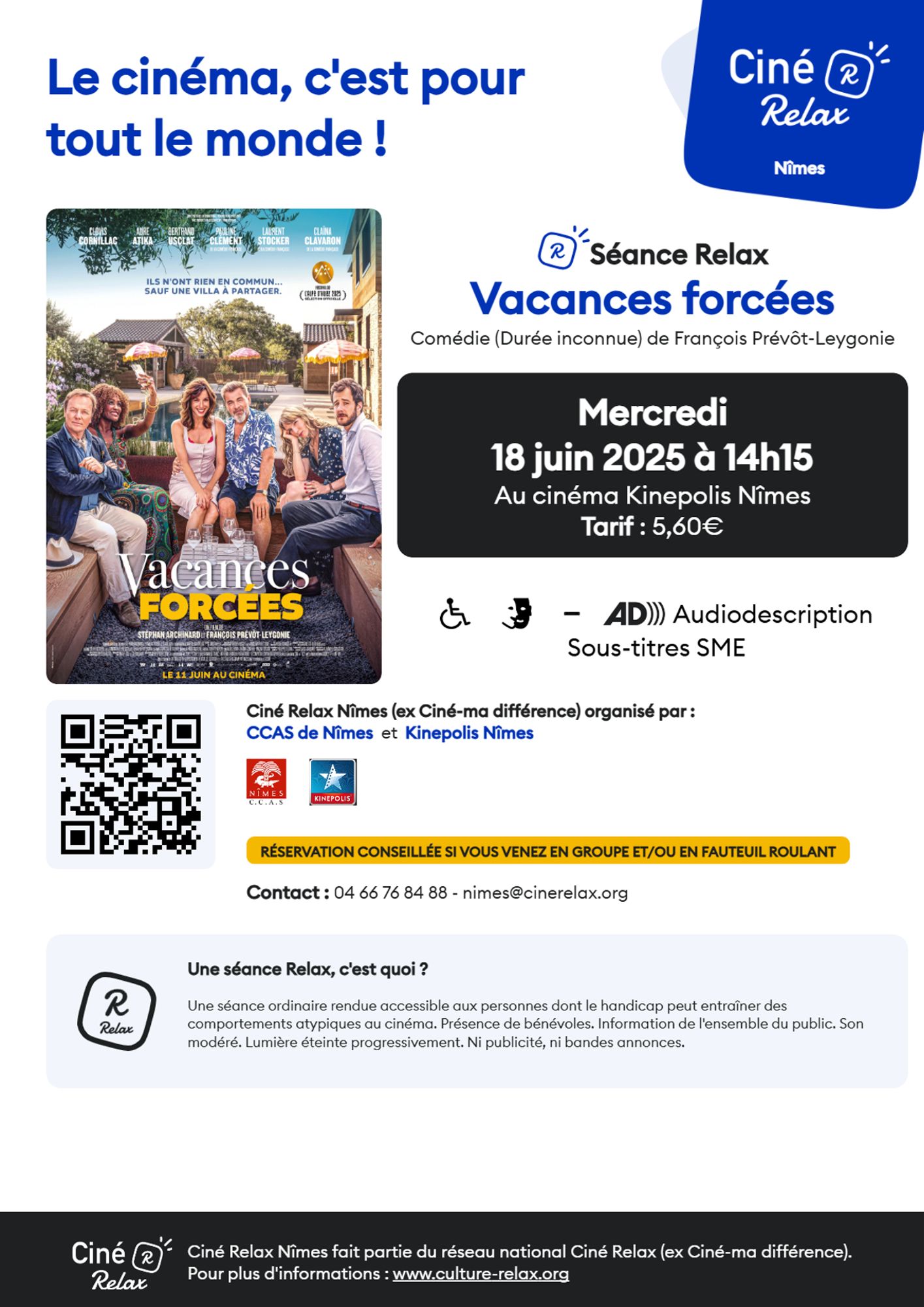 Le CCAS de Nîmes, en lien avec Madame Mylène MOUTON adjointe déléguée à l'Egalité, au Droit des Femmes, aux Handicaps, à la Lutte contre les Discriminations et à l'Aide aux Victimes, a le plaisir de vous communiquer la date de la prochaine séance "Ciné Relax" programmée au Cinéma Le KINEPOLIS