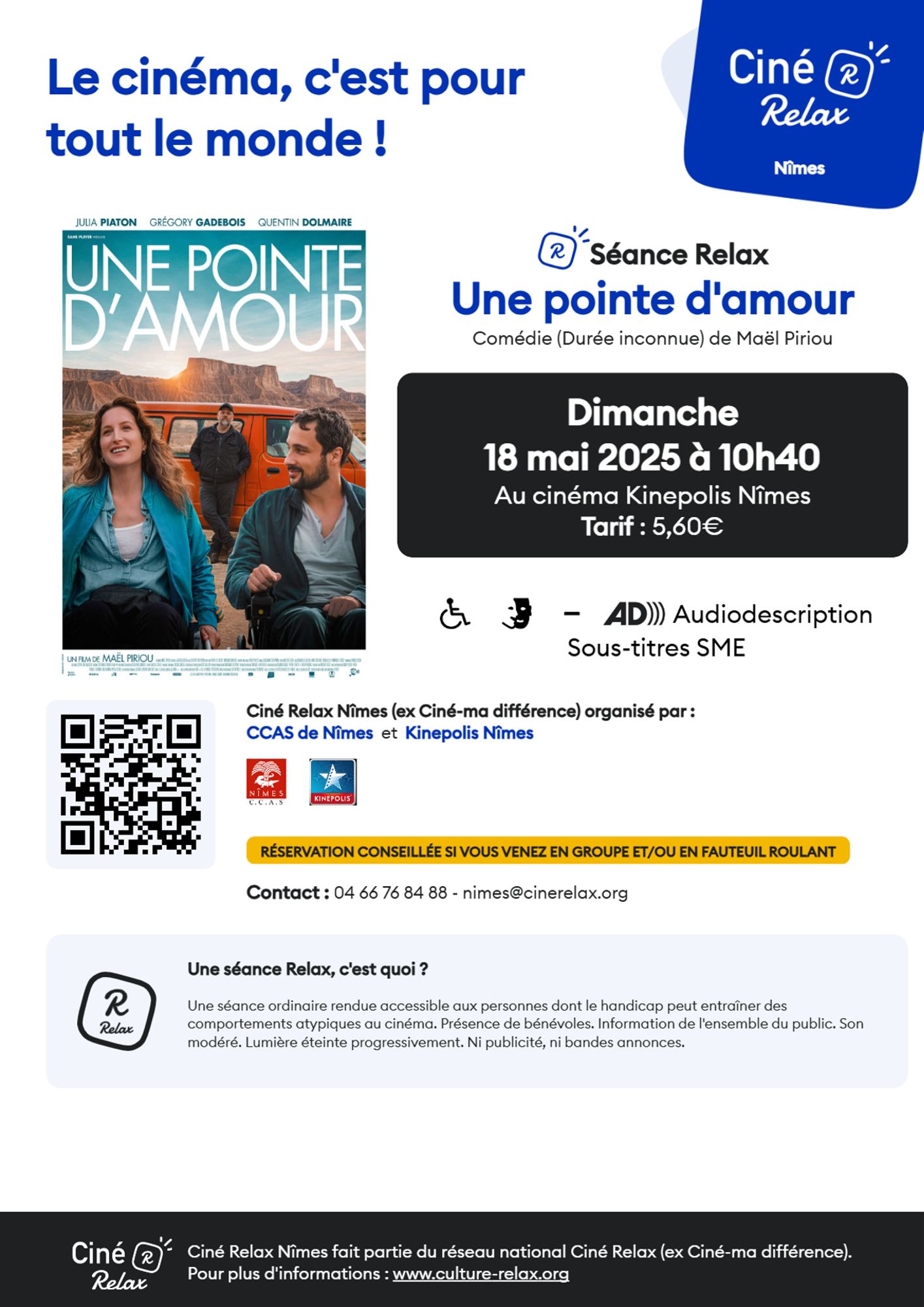 Le CCAS de Nîmes, en lien avec Madame Mylène MOUTON adjointe déléguée à l'Egalité, au Droit des Femmes, aux Handicaps, à la Lutte contre les Discriminations et à l'Aide aux Victimes, a le plaisir de vous communiquer la date de la prochaine séance "Ciné Relax" programmée au Cinéma Le KINEPOLIS