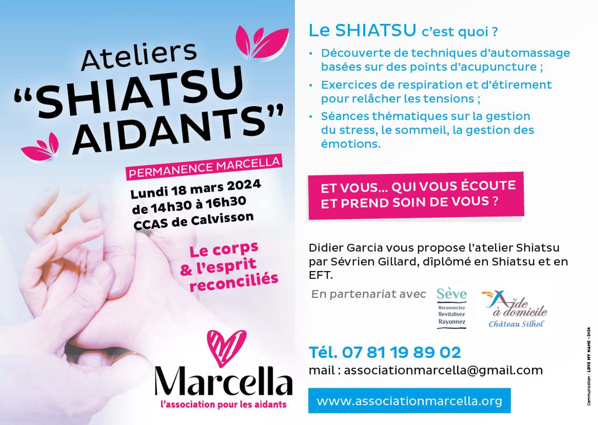 Didier Garcia, Président de l'association Marcella vous propose l'atelier Shiatsu par Sévrien Gillard, diplômé en Shiatsu et en EFT, en partenariat avec Sève (Reconnectez, Revitalisez, Rayonnez) et l'association Aide à domicile Château Silhol :