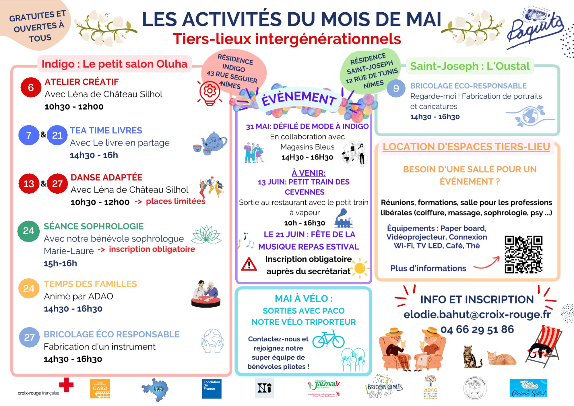 Retrouvez en téléchargement le planning des activités du mois de mai qui se déroulent au sein des tiers-lieux intergénérationnels des EHPAD Indigo et Saint-Joseph.