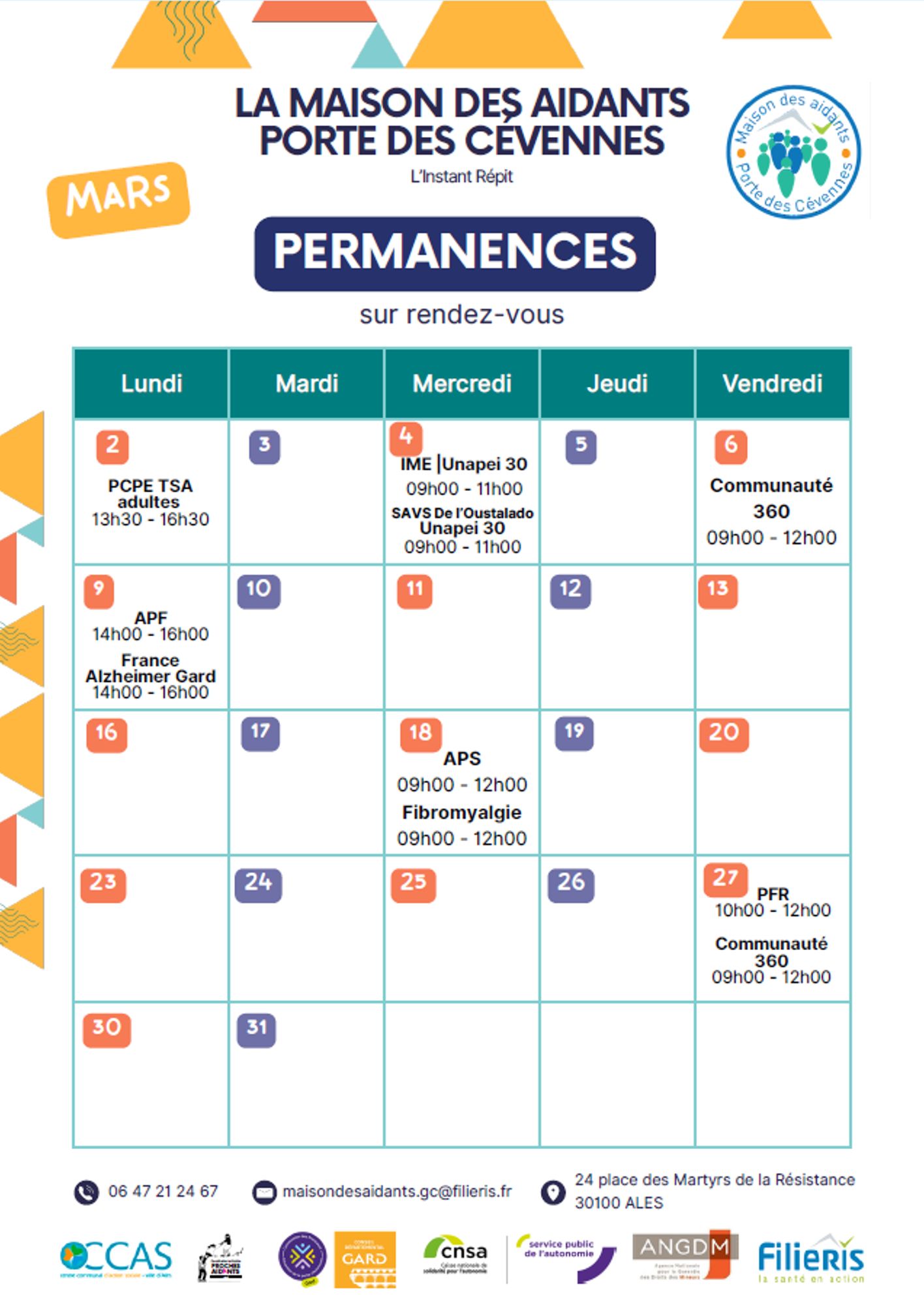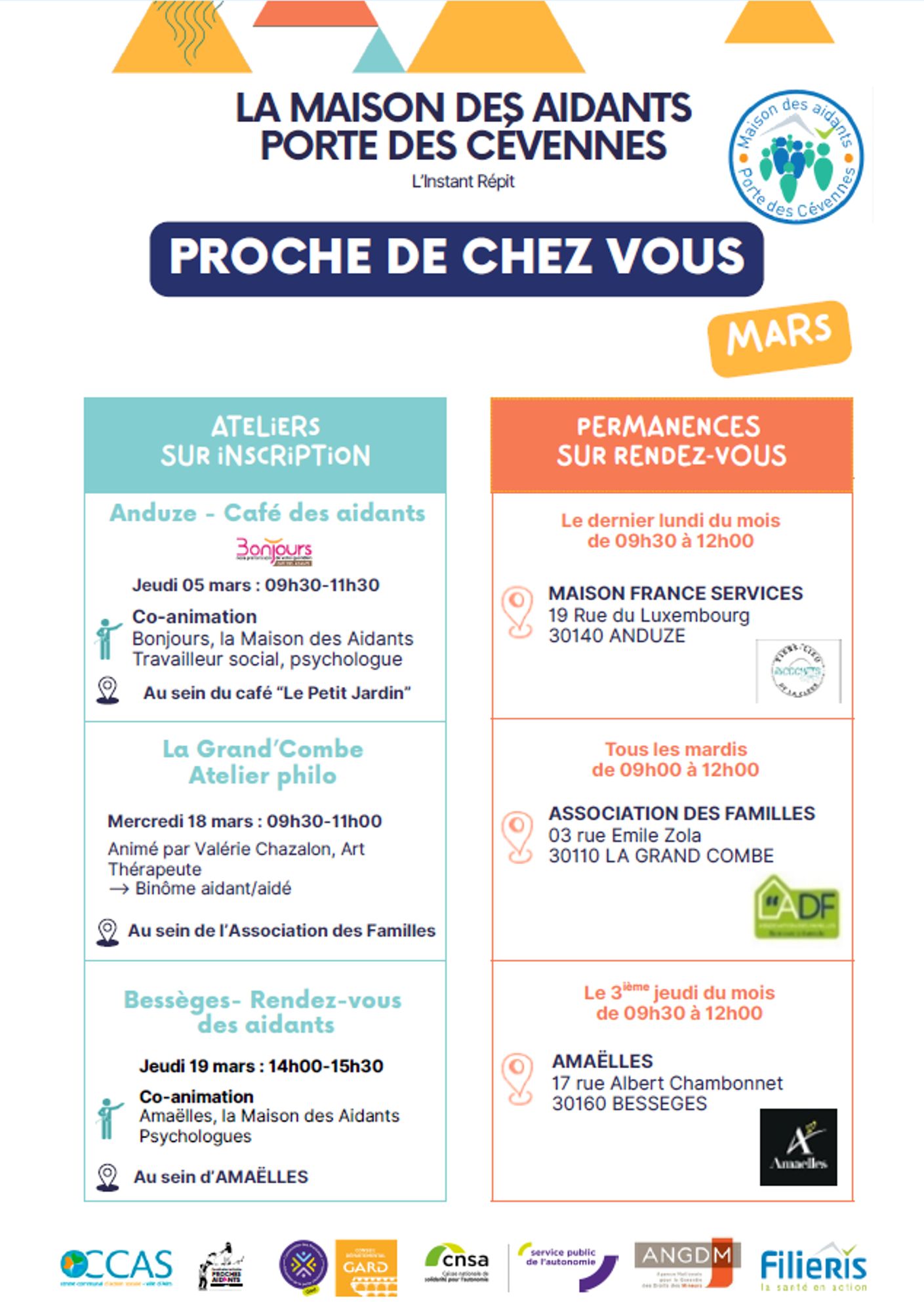 Programme de la Maison des aidants Programme de MARS Informations et inscriptions Maison des aidants Tél. : 06 47 21 24 67 Mail : maisondesaidants.gc@filieris.fr Télécharger le programme de la Maison des Aidants et les permanences des partenaires (1.5 Mo)