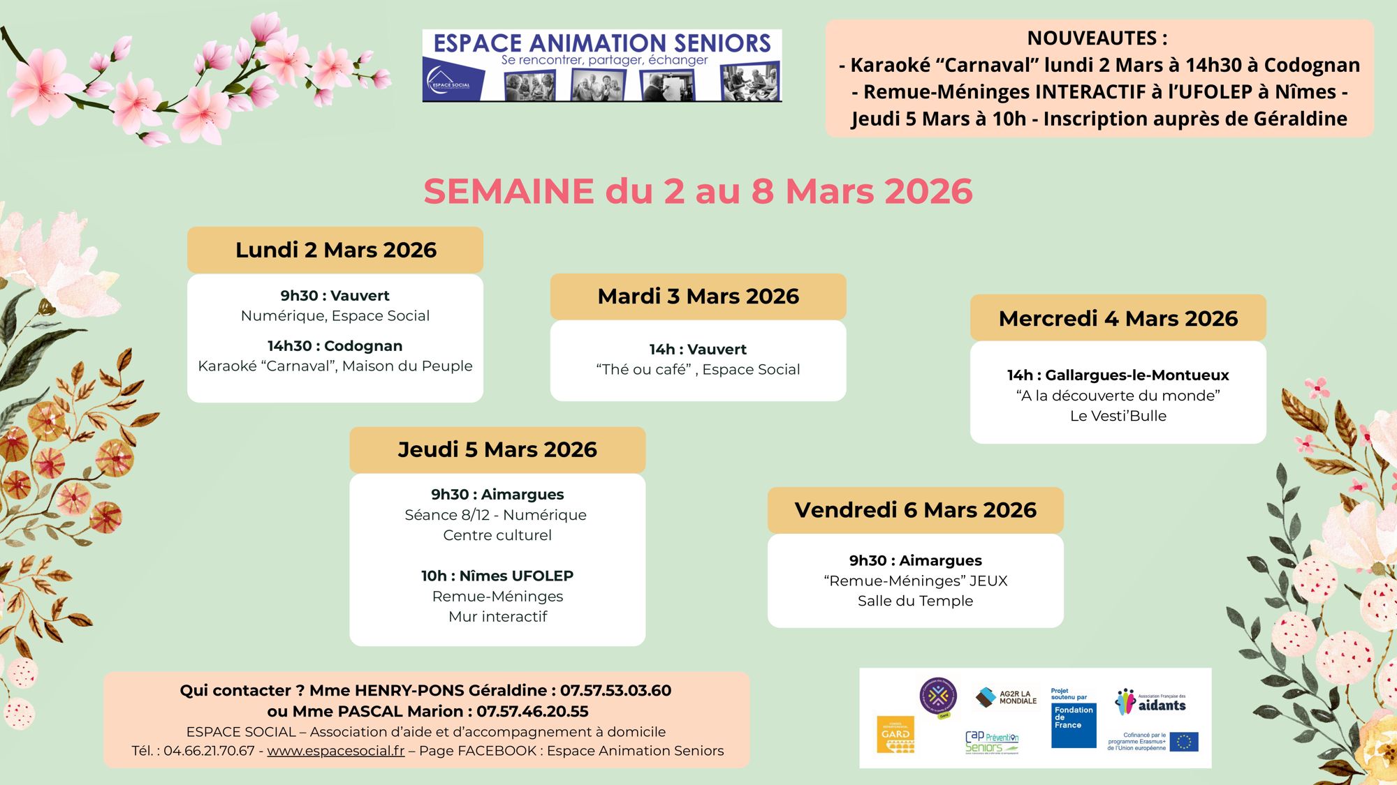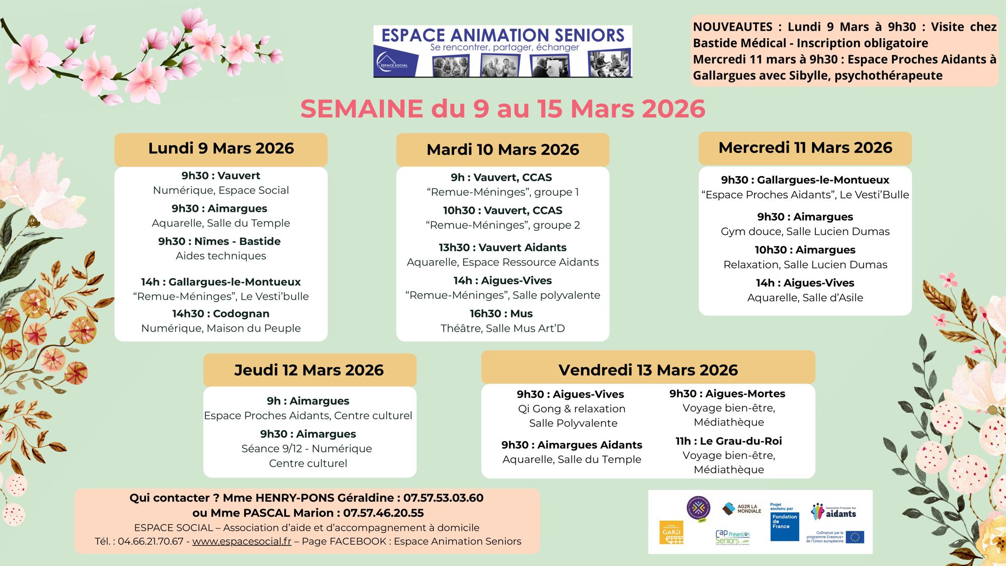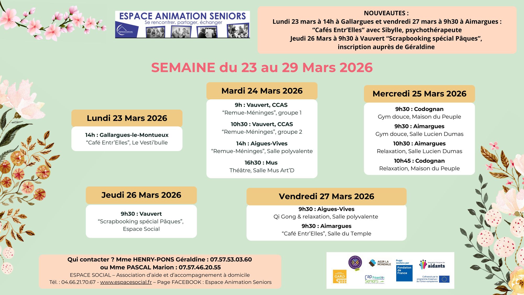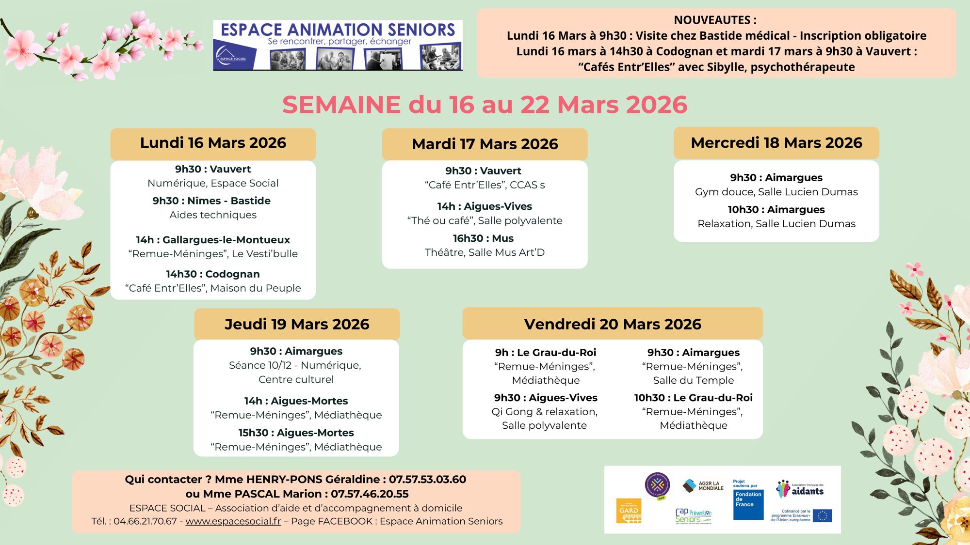 ESPACE SOCIAL organise des actions collectives avec les partenaires locaux (mairies, CCAS, CMS…) sur différentes communes : Le Grau-du-Roi, Aigues-Mortes, Saint-Laurent-d’Aigouze, Aimargues, Le Cailar, Gallargues-le-Montueux. Aigues-Vives, Mus, Codognan et Vauvert (Planning en téléchargement en bas de page).