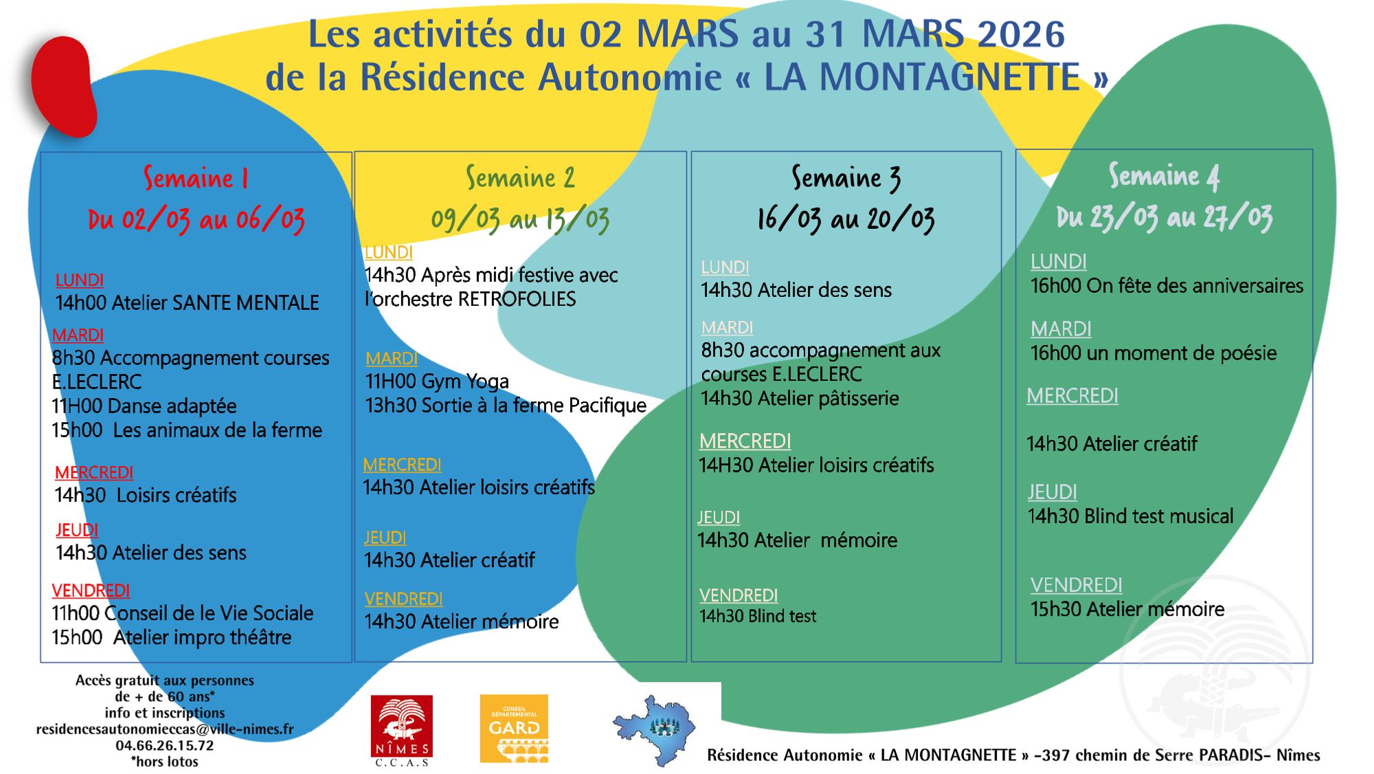 Retrouvez en téléchargement en bas de page le planning des animations qui se dérouleront au mois de MARS à la Résidence autonomie « La Montagnette ».