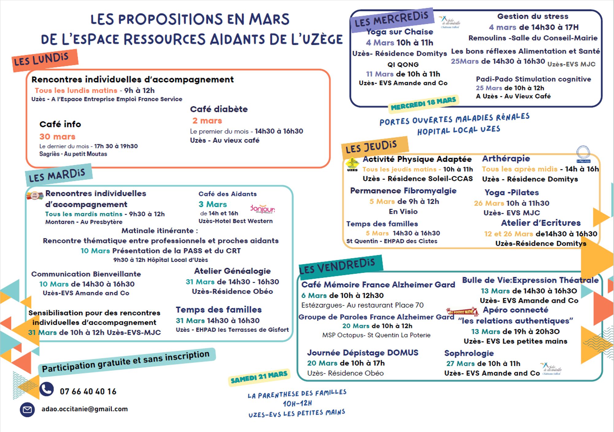 Retrouvez ci-dessous les activités du mois de MARS de l'Espace Ressources Aidants de l'Uzège.