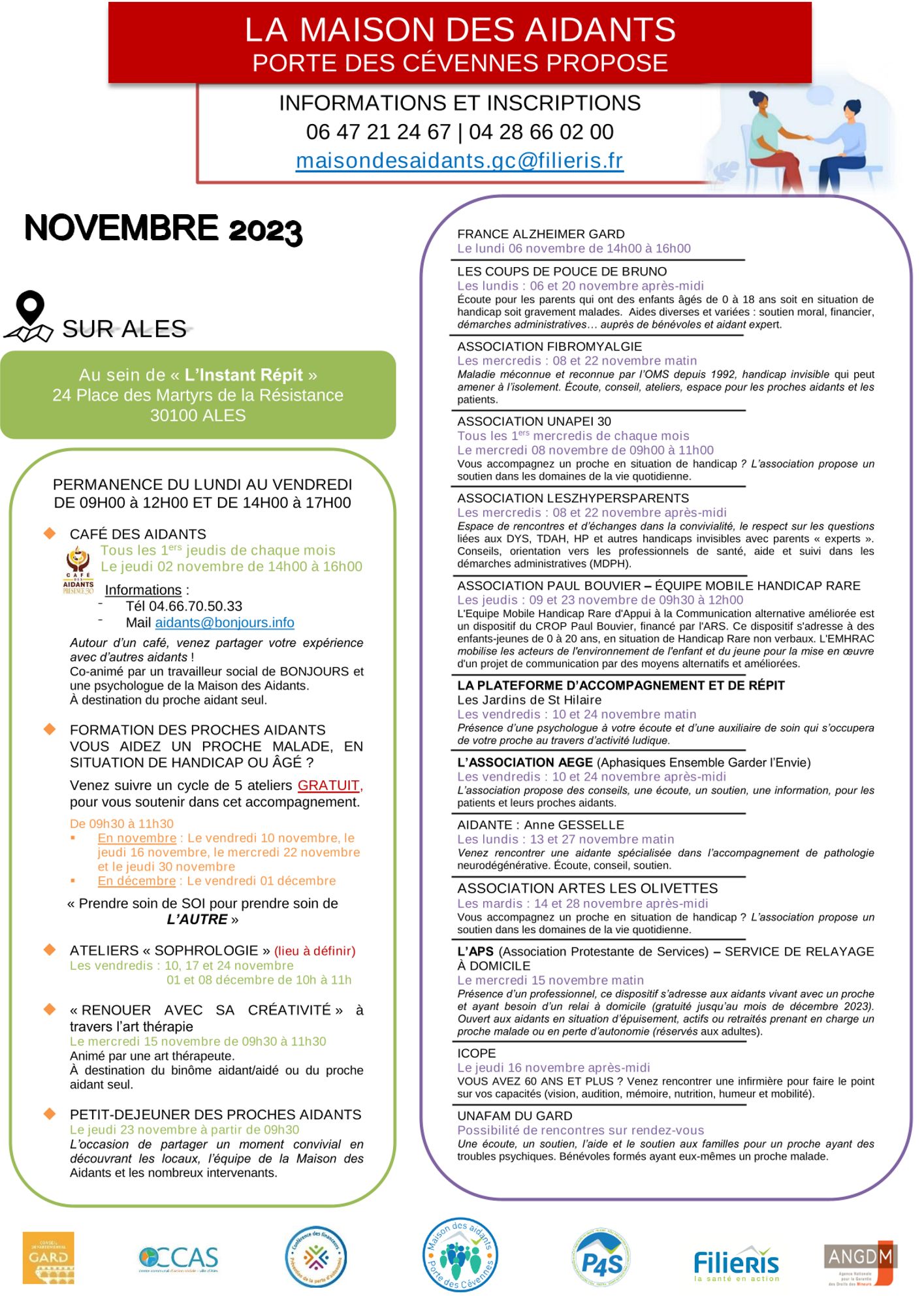 - Café des aidants, le jeudi 9 novembre de 9h30 à 11h30