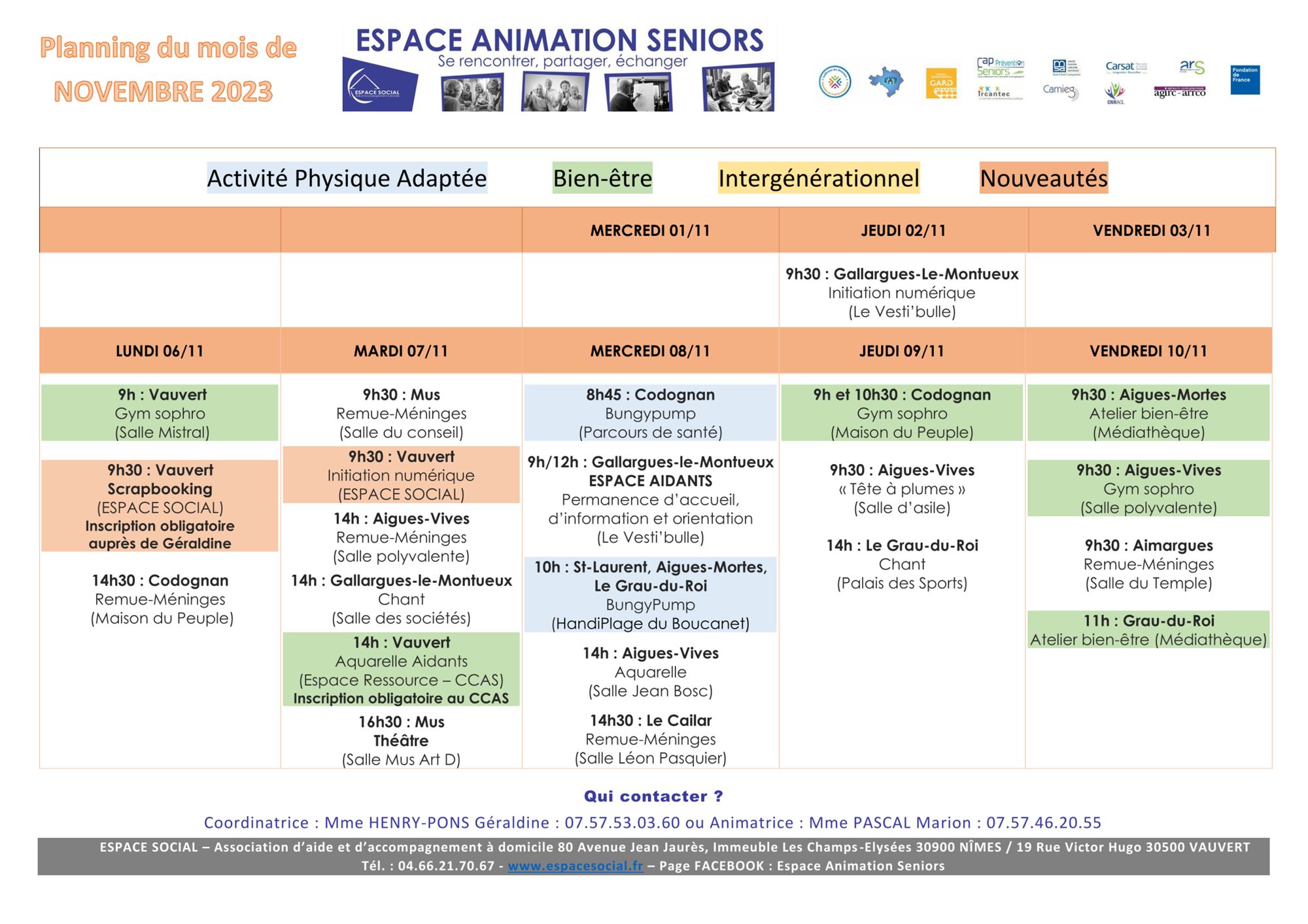 ESPACE SOCIAL organise des actions collectives avec les partenaires locaux (mairies, CCAS, CMS…) sur différentes communes : Le Grau-du-Roi, Aigues-Mortes, Saint-Laurent-d’Aigouze, Aimargues, Le Cailar et Gallargues-le-Montueux. Aigues-Vives, Mus, Codognan (Planning en téléchargement en bas de page).