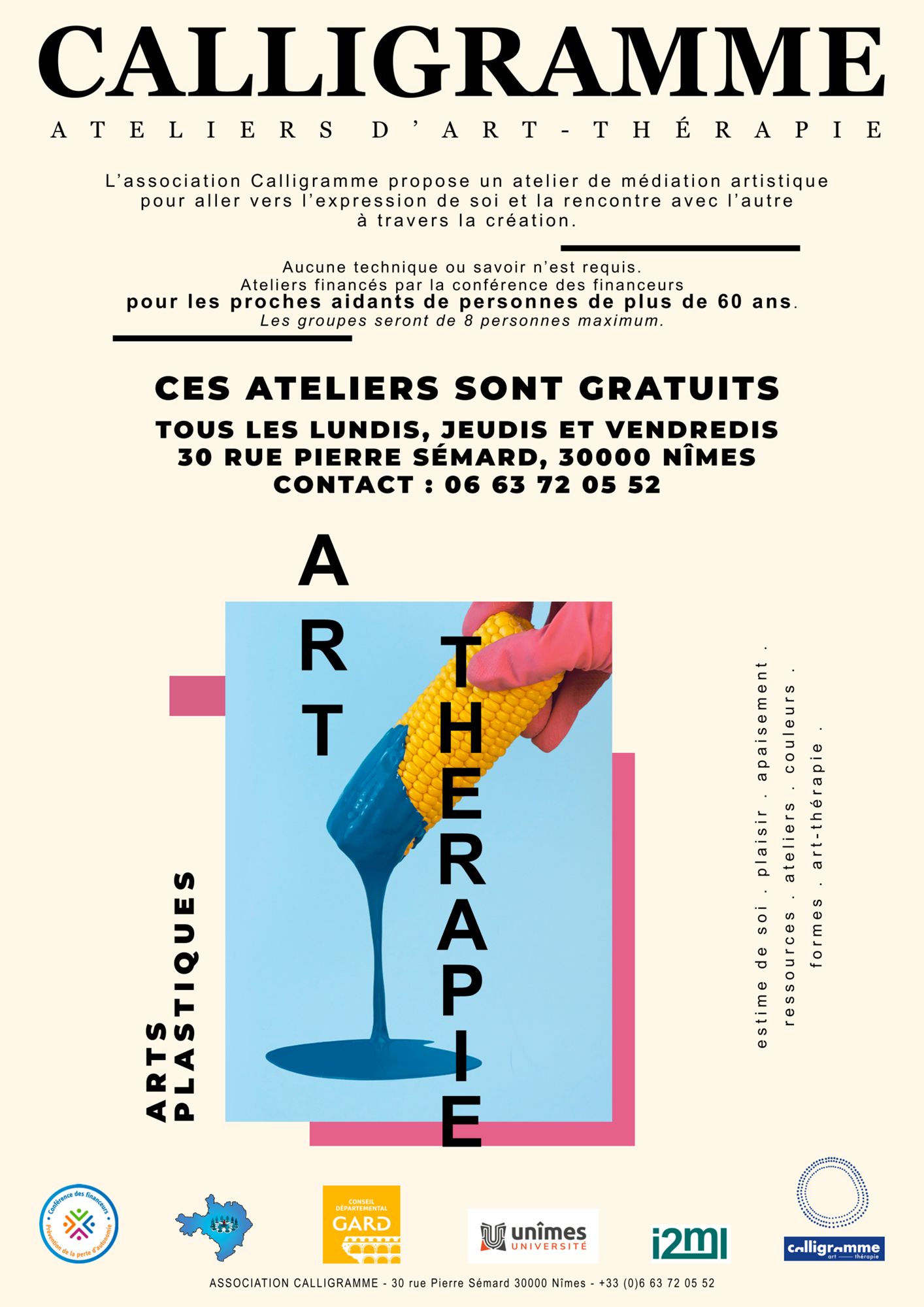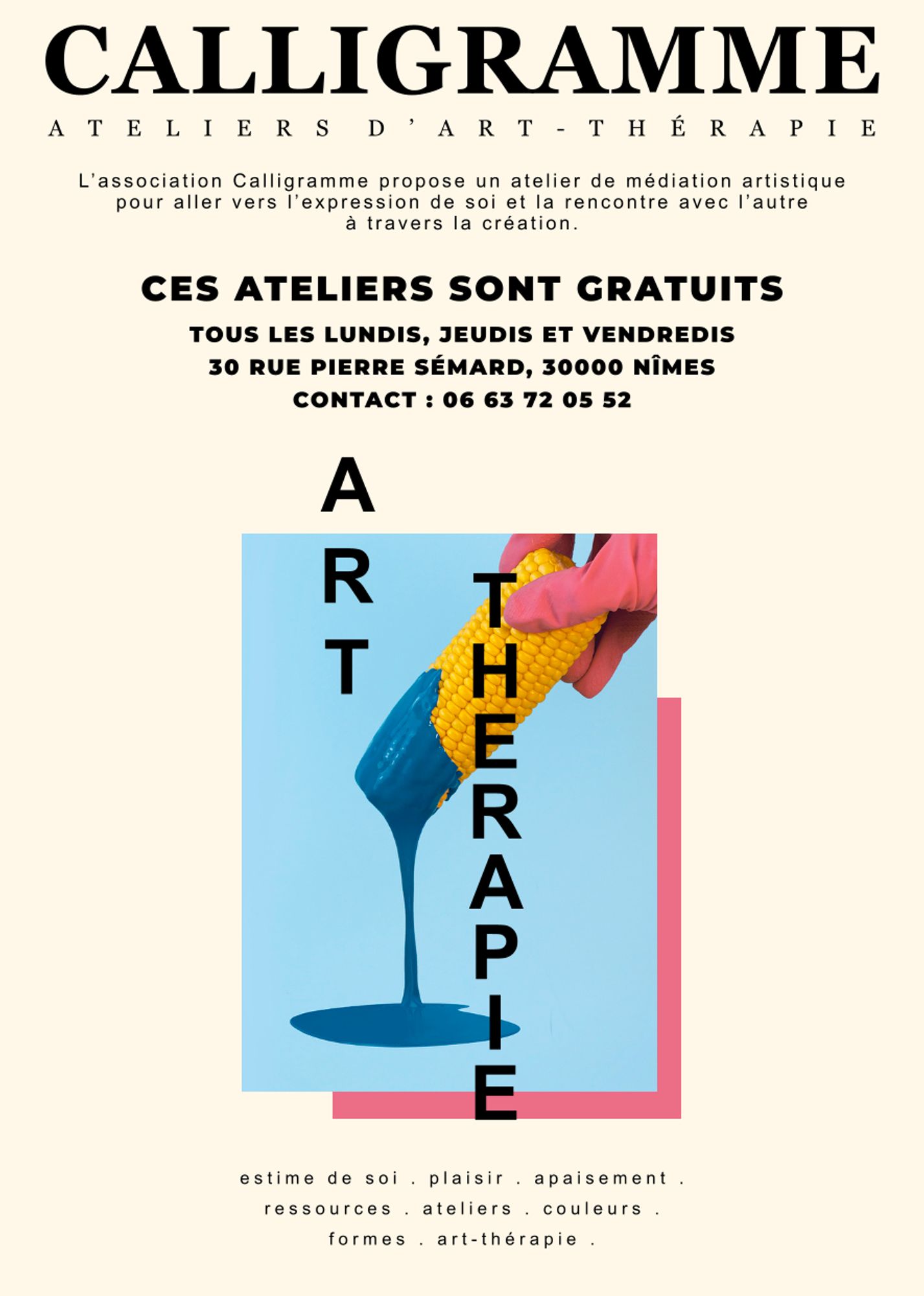 Nous avons le plaisir de vous inviter aux nouveaux ateliers d'art-thérapie gratuits, à Nîmes, animés par l’Association Caligramme et l’Université de Nîmes. Ces sessions sont conçues pour offrir un espace de créativité et de bien-être, peu importe votre niveau ! Pas besoin de savoir peindre ou dessiner, juste de l'envie de partager un moment agréable.