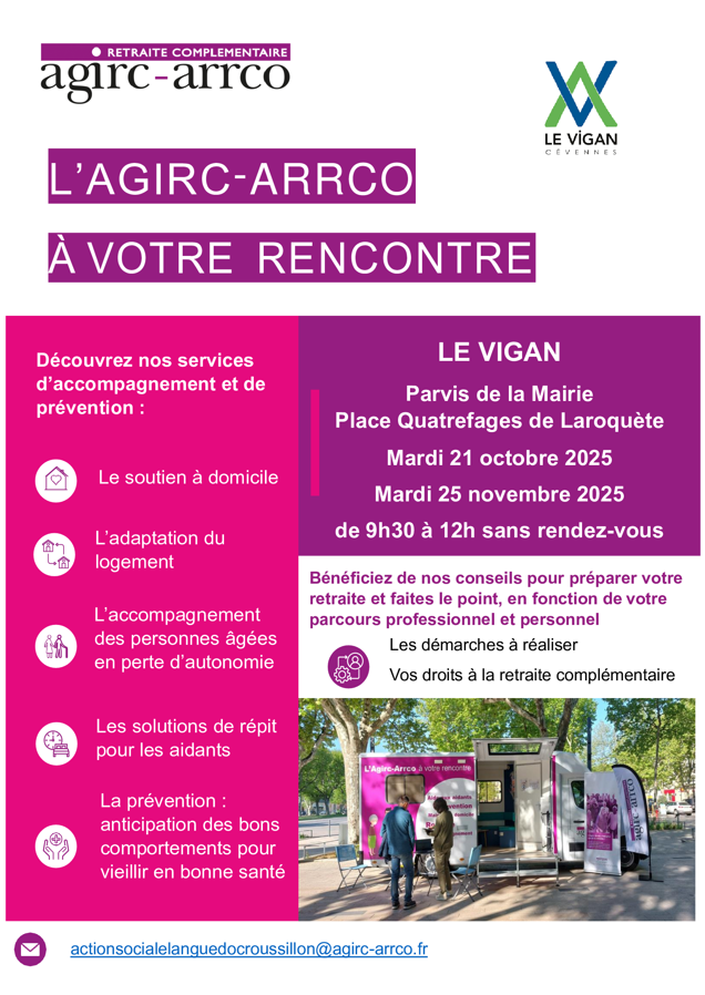 Le service itinérant « l’Agirc-Arrco à votre rencontre » revient au Vigan, sur le parvis de la Mairie, de 9h30 à 12h00 :