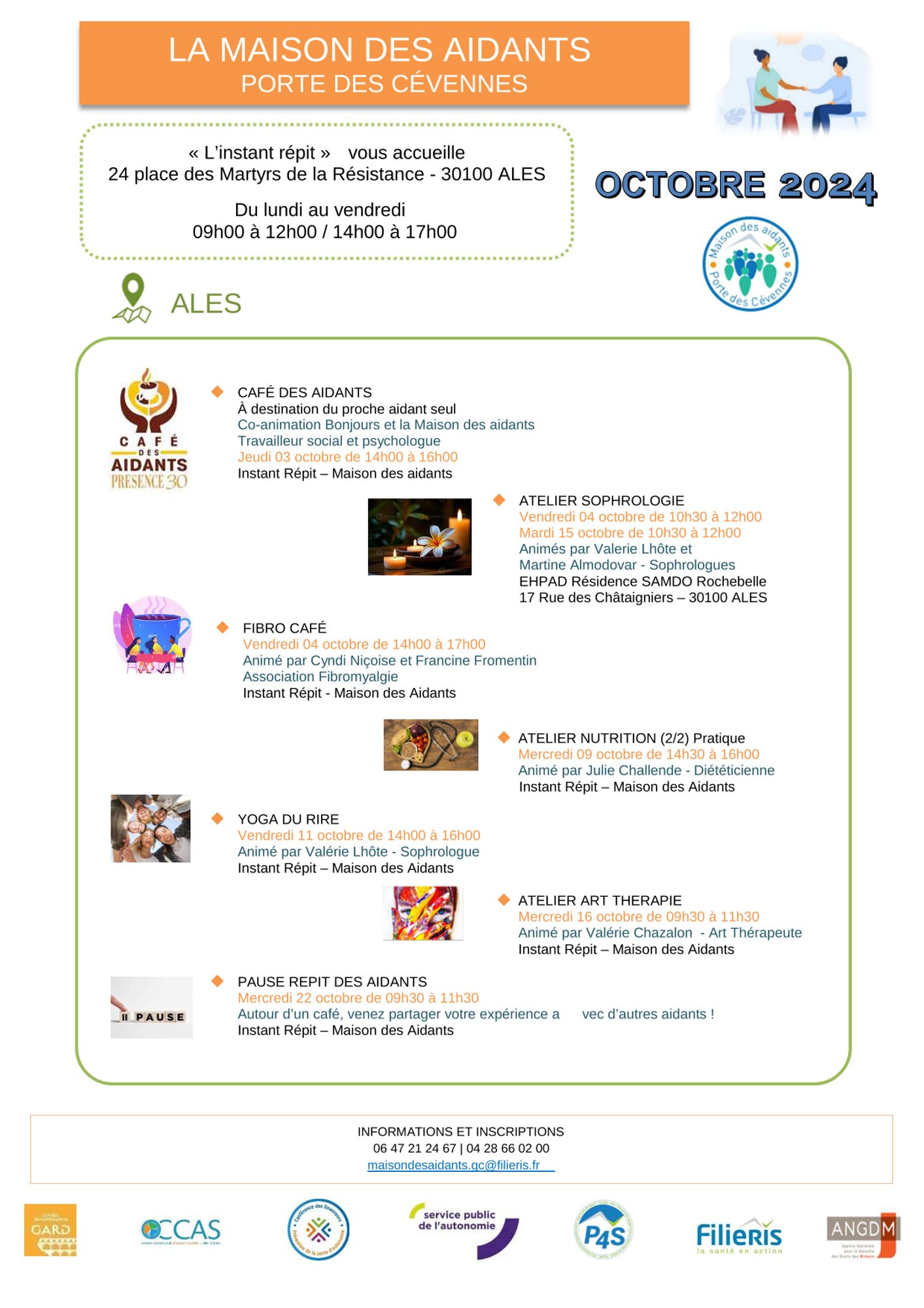 - Ateliers de "Sophrologie" - 4 octobre de 10h30 à 12h - 15 octobre de 10h30 à 12h dans les locaux de l'EHPAD Rés. SAMDO Rochebelle : 17 rue des Châtaigniers à Alès