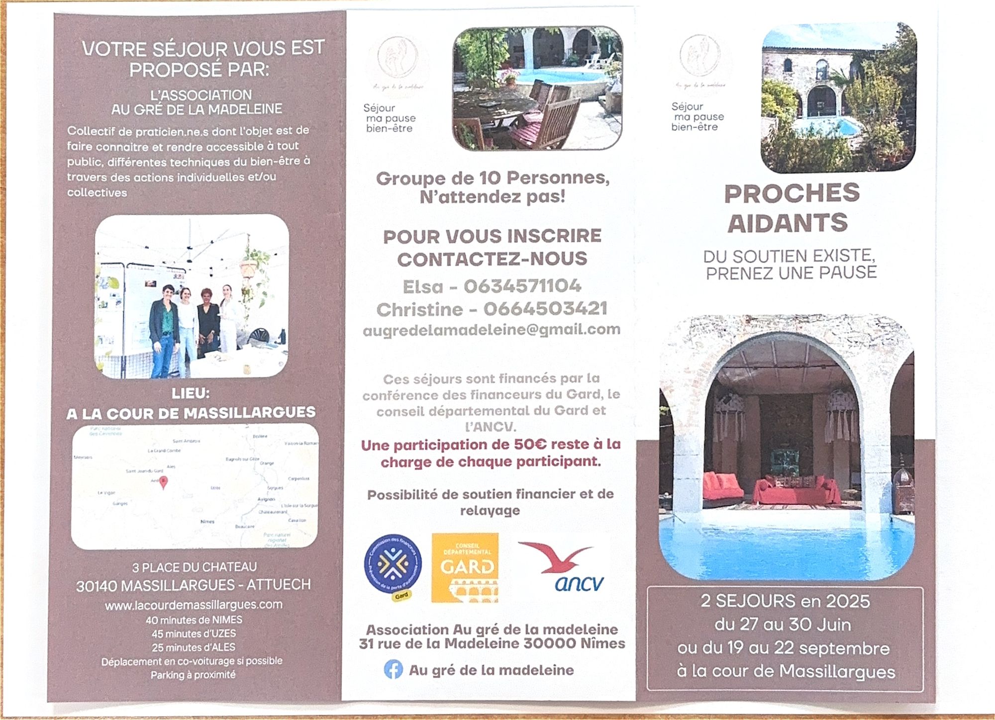 L'association Au gré de la Madeleine a le plaisir de vous proposer 1 séjour bien-être qui se déroulerà à Massillargues-Attuech, du 19 au 22 Septembre.
