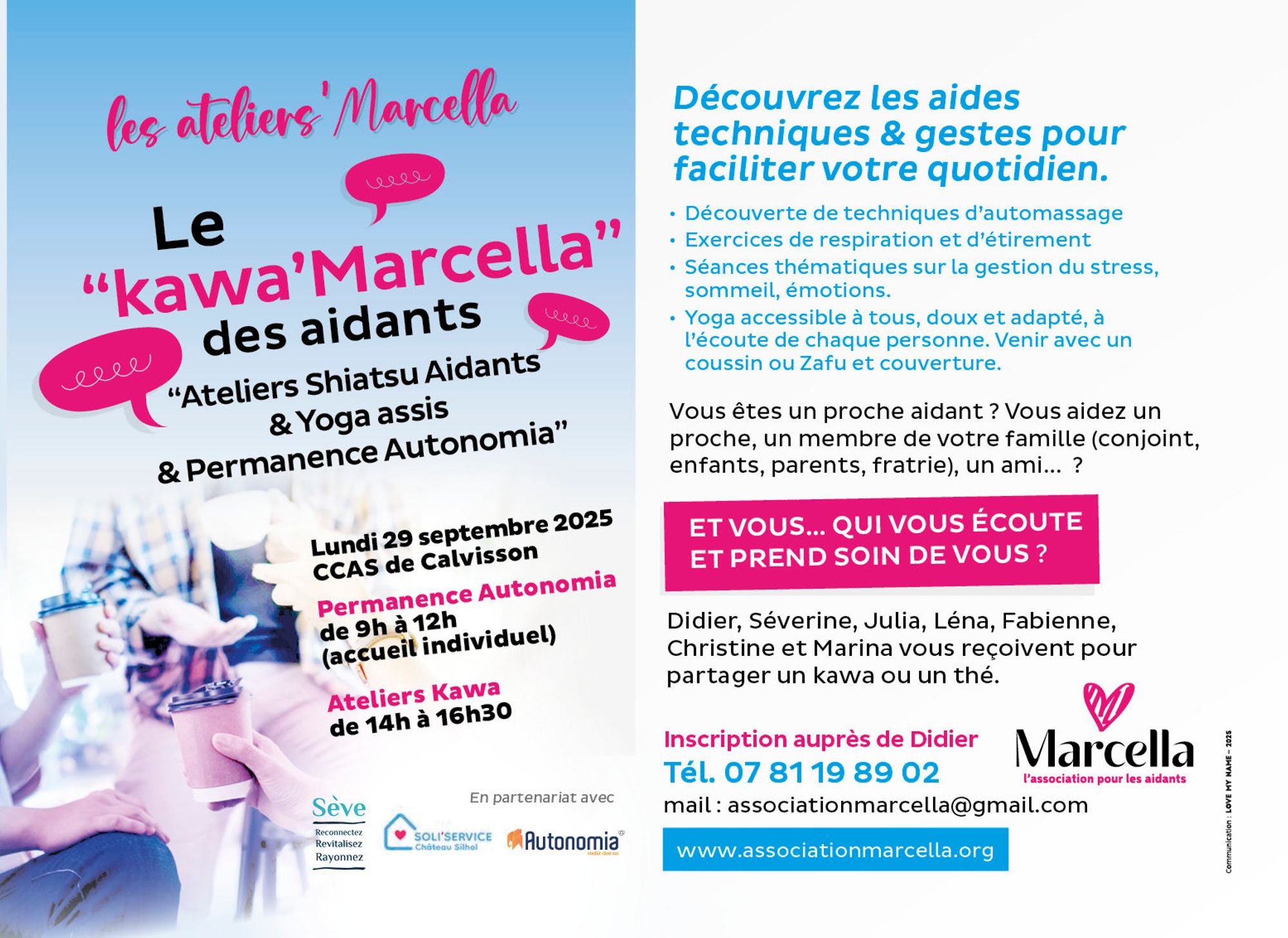 Atelier Shiatsu Aidants & Yoga assis & Permanence autonomia 29 septembre 2025 - Calvisson Atelier Shiatsu Aidants & Yoga assis & Permanence autonomia Lundi 29 septembre 2025 Permanence Autonomia de 9h à 12h Ateliers Kawa de 14h à 16h30 au CCAS de Calvisson Inscription auprès de Didier Tél. : 07 81 19 89 02 Mail : associationmarcella@gmail.com Site : https://associationmarcella.org/ Télécharger le flyer (480.4 Ko)