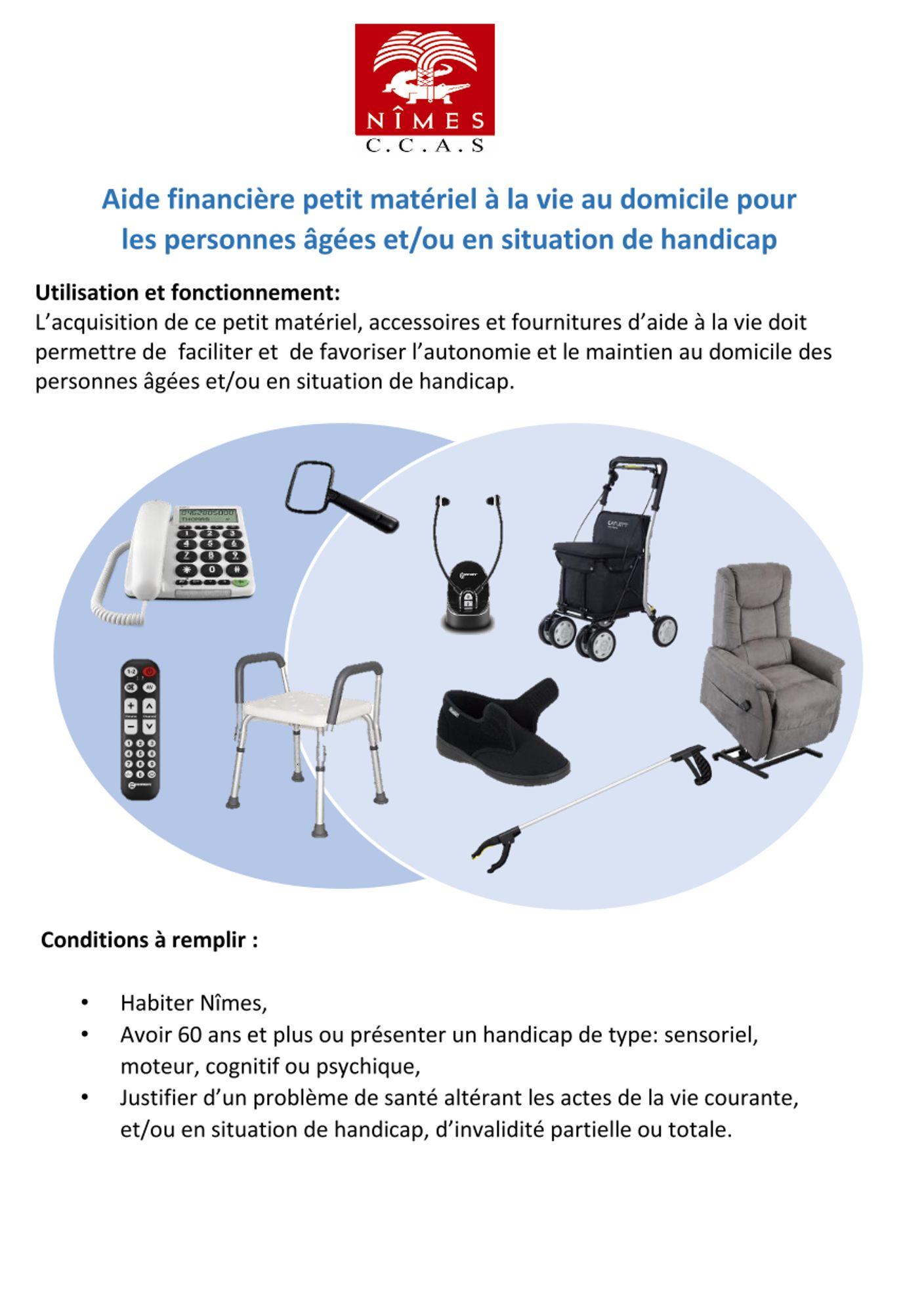 Le CCAS de Nîmes propose aux résidents nîmois une aide à l'acquisition de petit matériel favorisant l'autonomie et le maintien à domicile des personnes âgées et/ou en situation de handicap. Téléphone à gros caractères, loupe, siège de bain ... peuvent être pris en charge dans le cadre de ce financement.